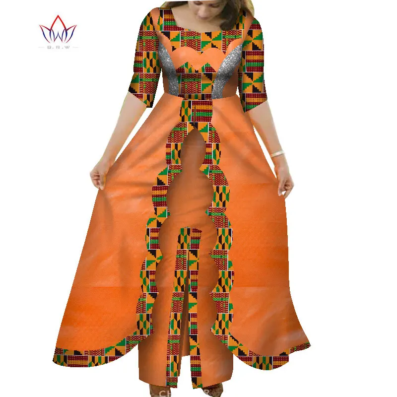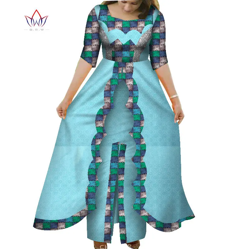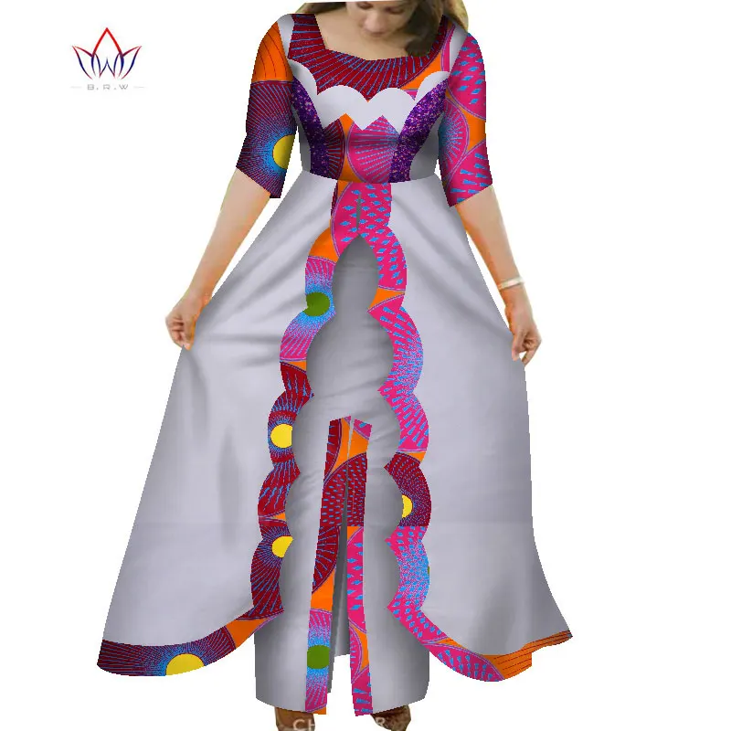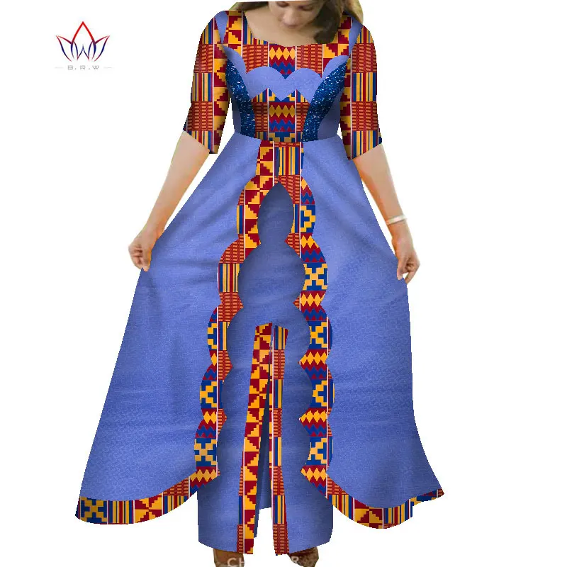 Bintarealwax африканские платья для женщин Дашики с круглым вырезом двухслойная длинная юбка одежда Pachwork вечерние коротким рукавом вечернее платье WY7961