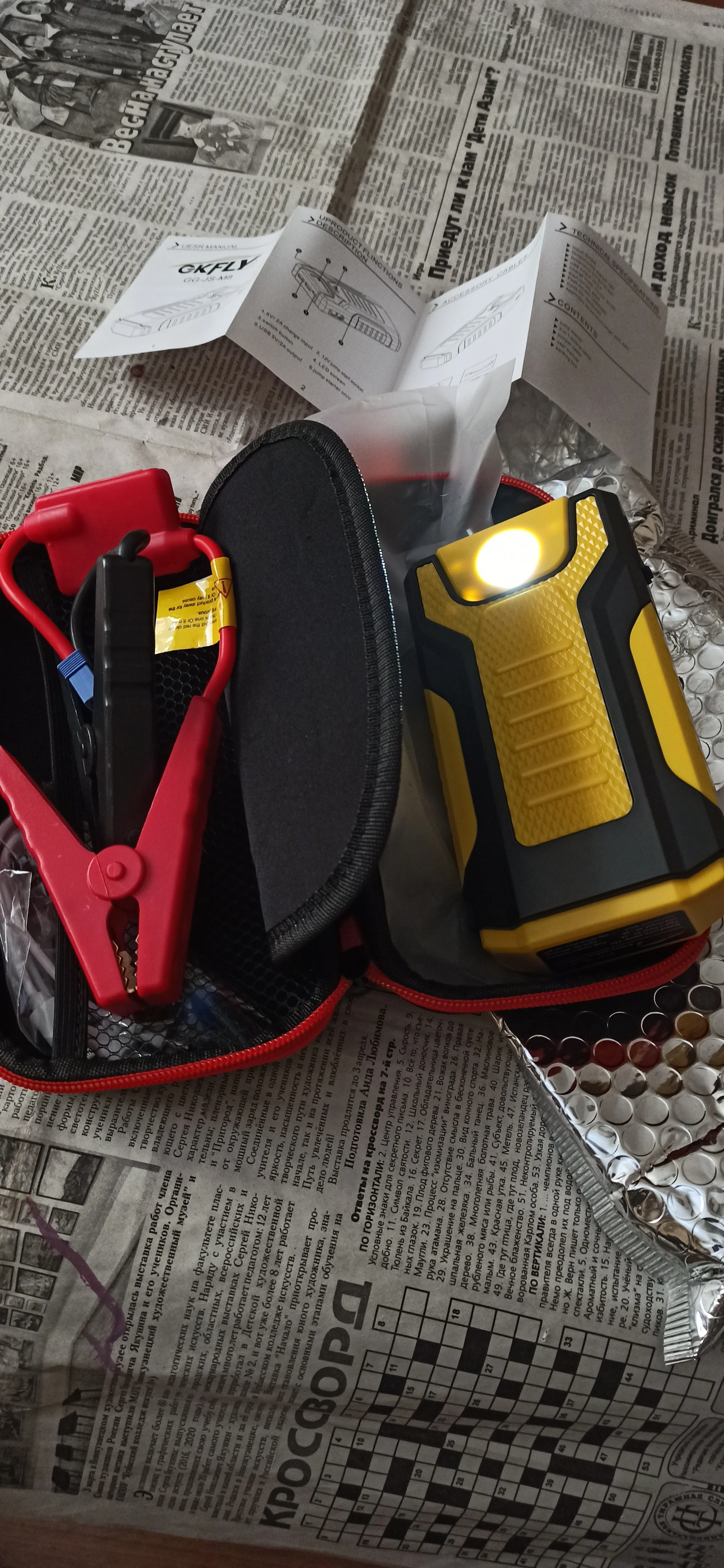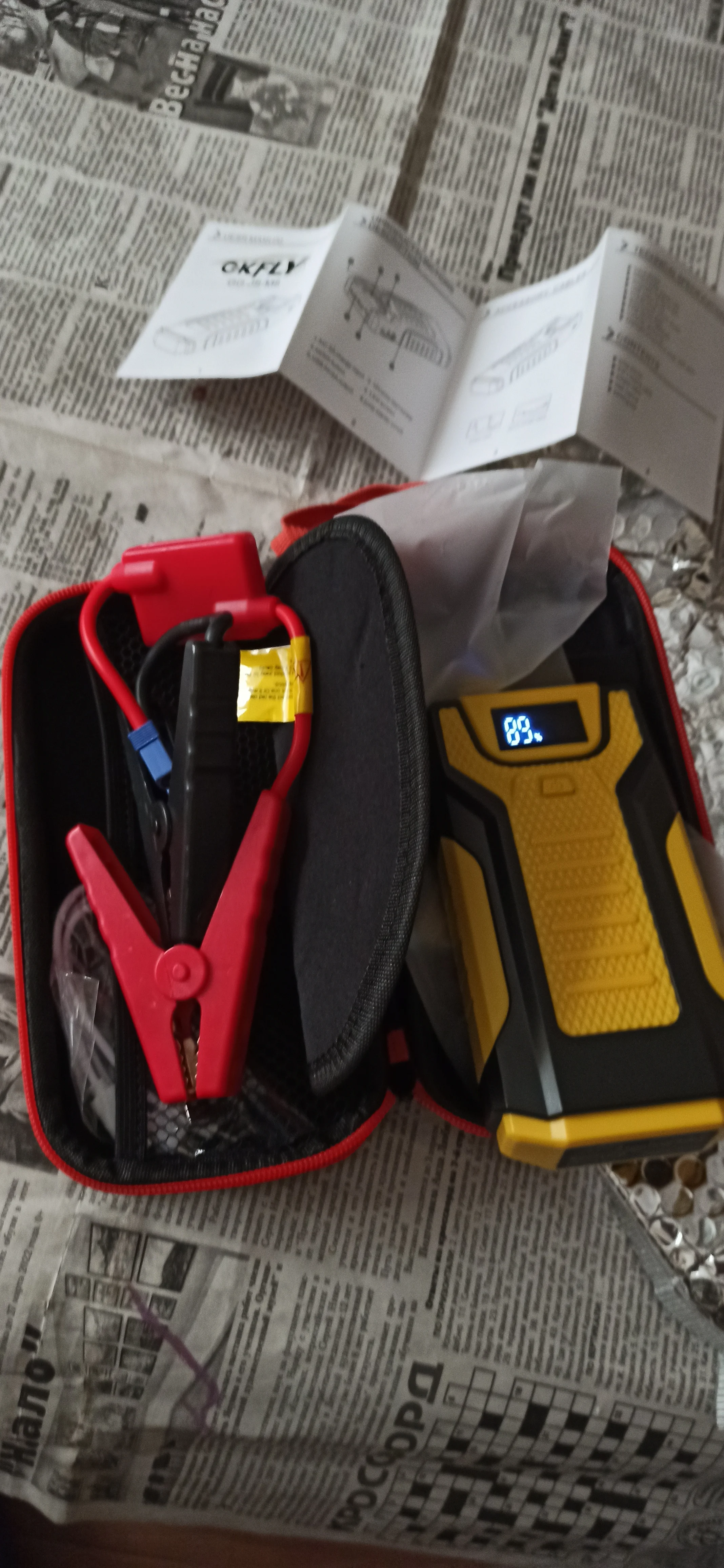 Только получил. Добротный чехол, в нем пусковое устройство. Все соответствует описанию. Заряд 95%. Фонарик включается в разных режимах. Проверить на авто сейчас не могу. Нет руководства на русском. Надеюсь будет запускать двигатель 2,5 бензин.