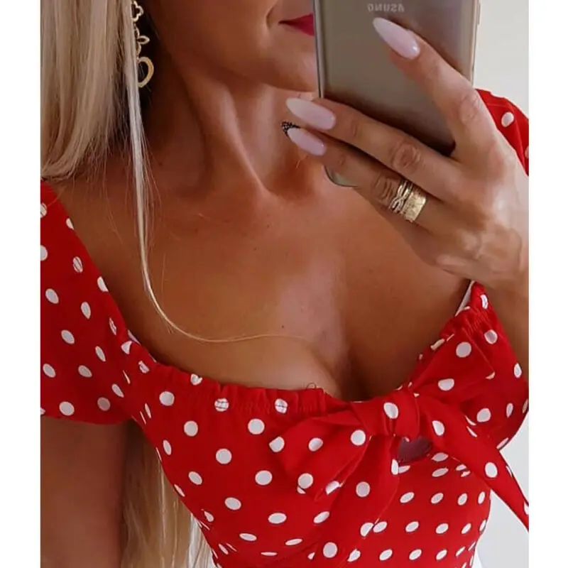 Футболка женская в горошек, Повседневная модная пикантная хлопковая рубашка с короткими рукавами, приталенный Повседневный Топ с квадратным воротником и бантом, на лето