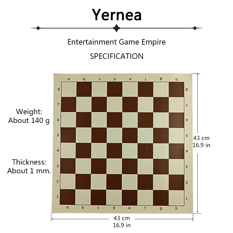Особенности:1. Размер шахматной доски 43*43 см (16,9*16,9 дюйма).2. Вес: около 140 г.3. Толщина: около 1,0 мм.4. Проверка Размер: около 4,8*4,8 см.5. Стандартная шахматная доска.6. Подходит для шахматных фигур диаметром ниже 4 см.7. Материал: ПВХ.