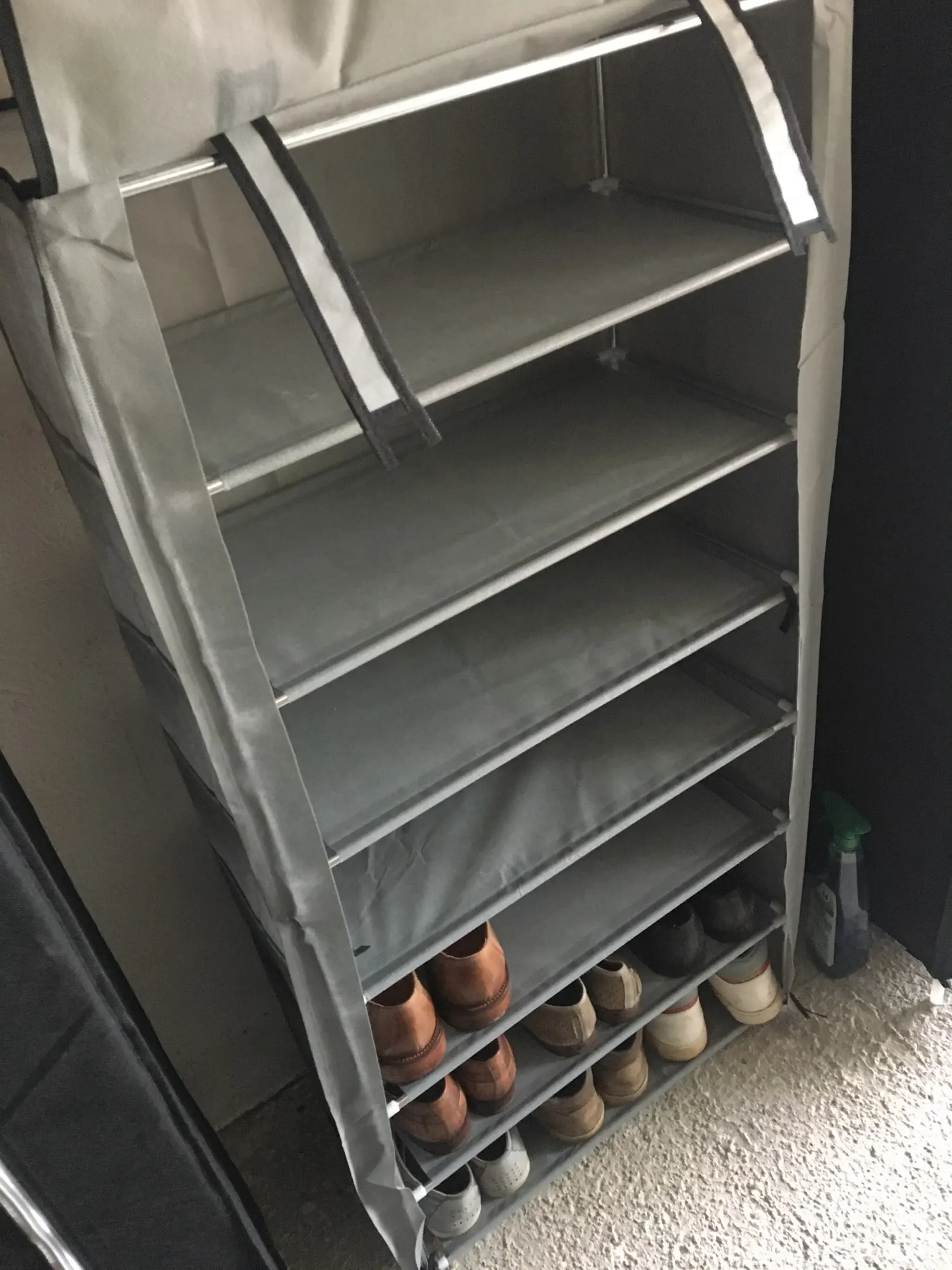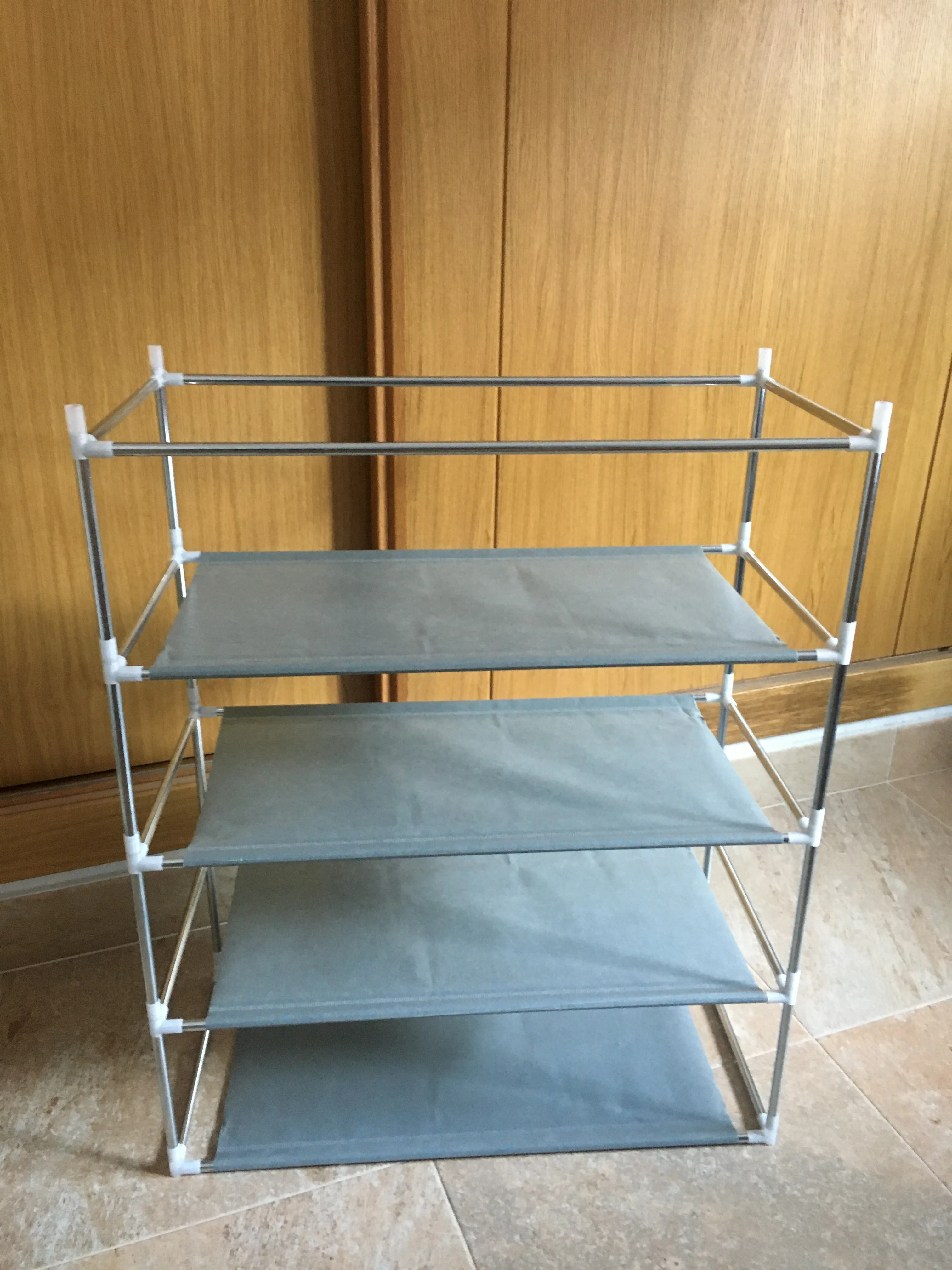 5-слойная Стойка поставляется с 4 пластиковыми полками, удерживаемыми плотно растягивающимися с помощью легких металлических стержней. На самом деле это пятое покрытие. Сверху верхнего слоя ничего не видно, так как стержни не растягиваются. Если бы они включали пятую пластмассовую «полку», которая может пройти под крышкой, это бы решить эту проблему.
