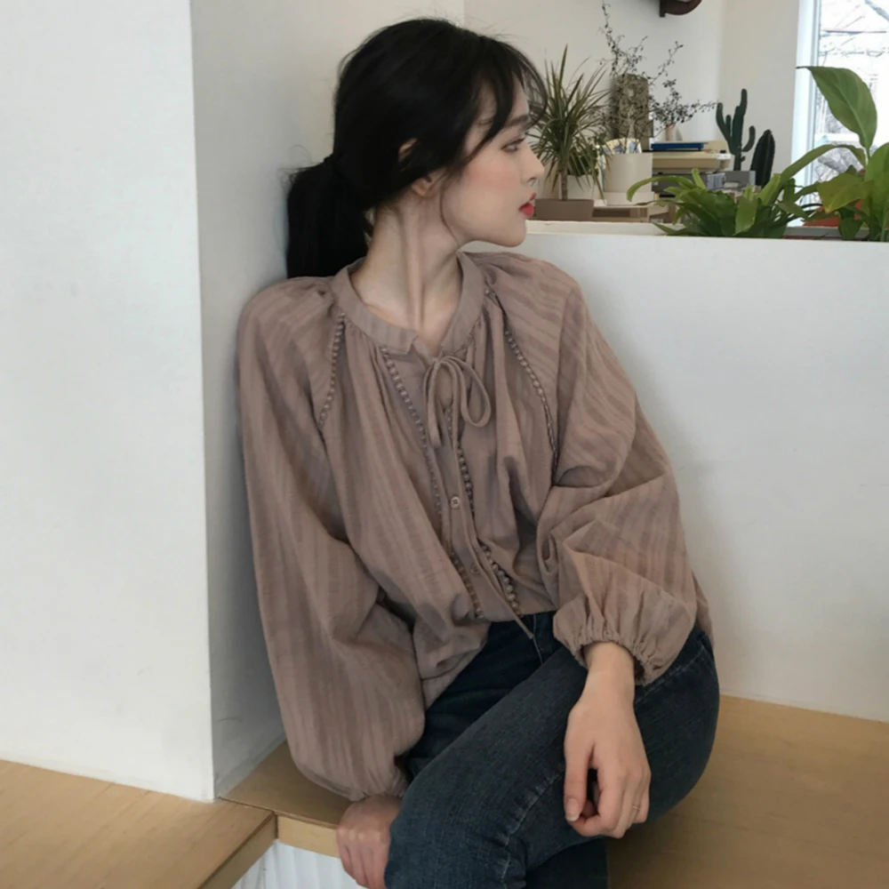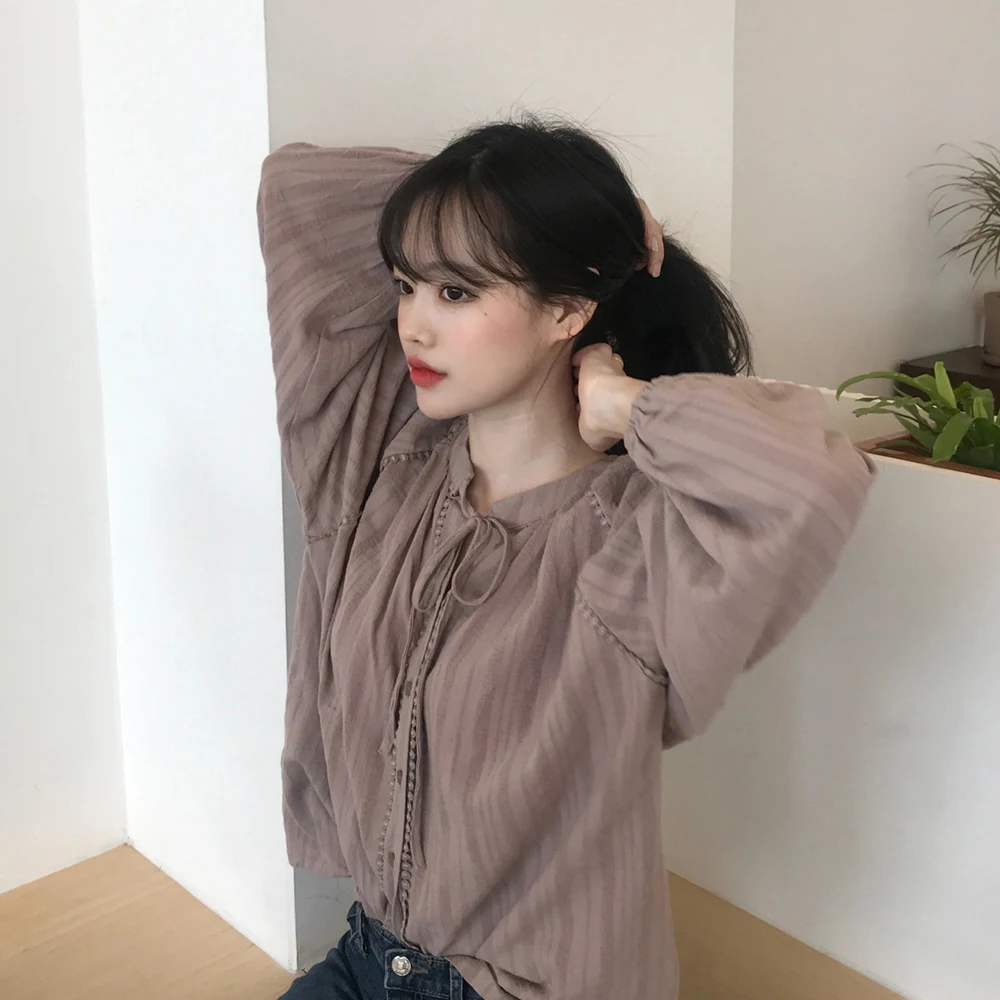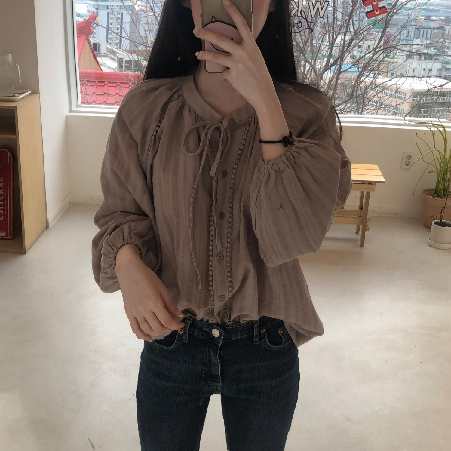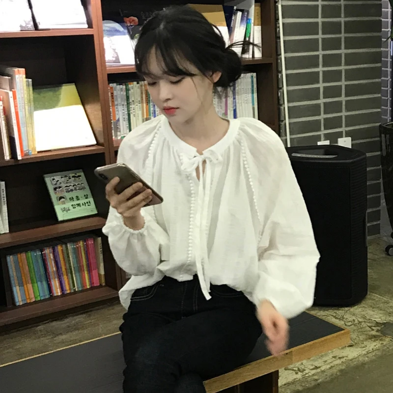 Демисезонная женская хлопковая свободная кружевная блузка с круглым вырезом, однобортная рубашка с рукавом реглан, топы на шнуровке 2020