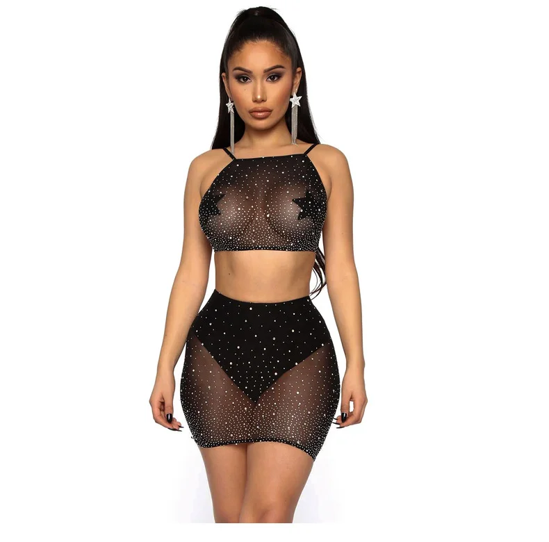 Сексуальный костюм Стразы с юбкой, черный блестящий короткий топ + ...