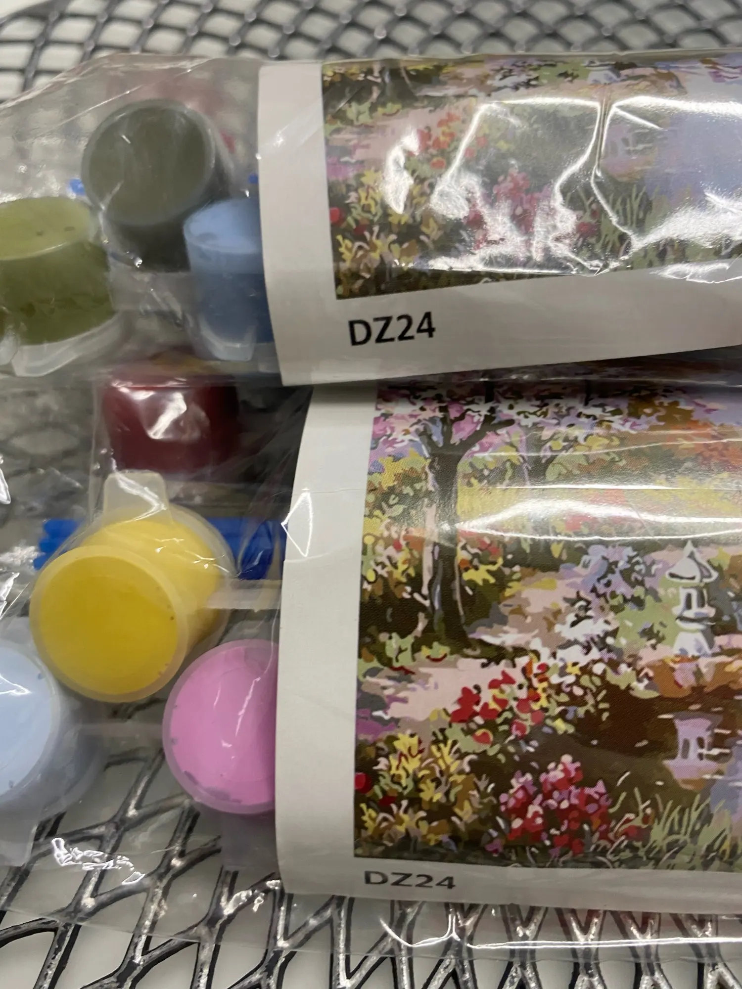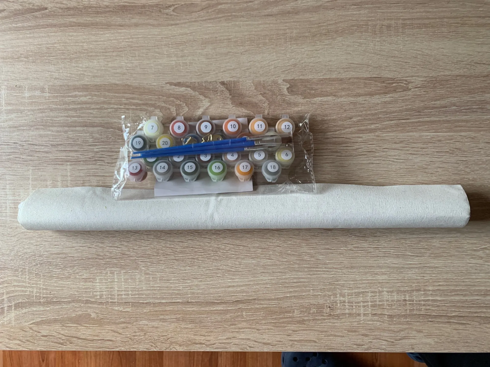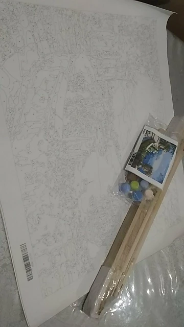 отличная комплектация, свернуто в рулон, ничего не заломлено и не помято. 2 комплекта кистей и красок. доставлена в течение 6 недель