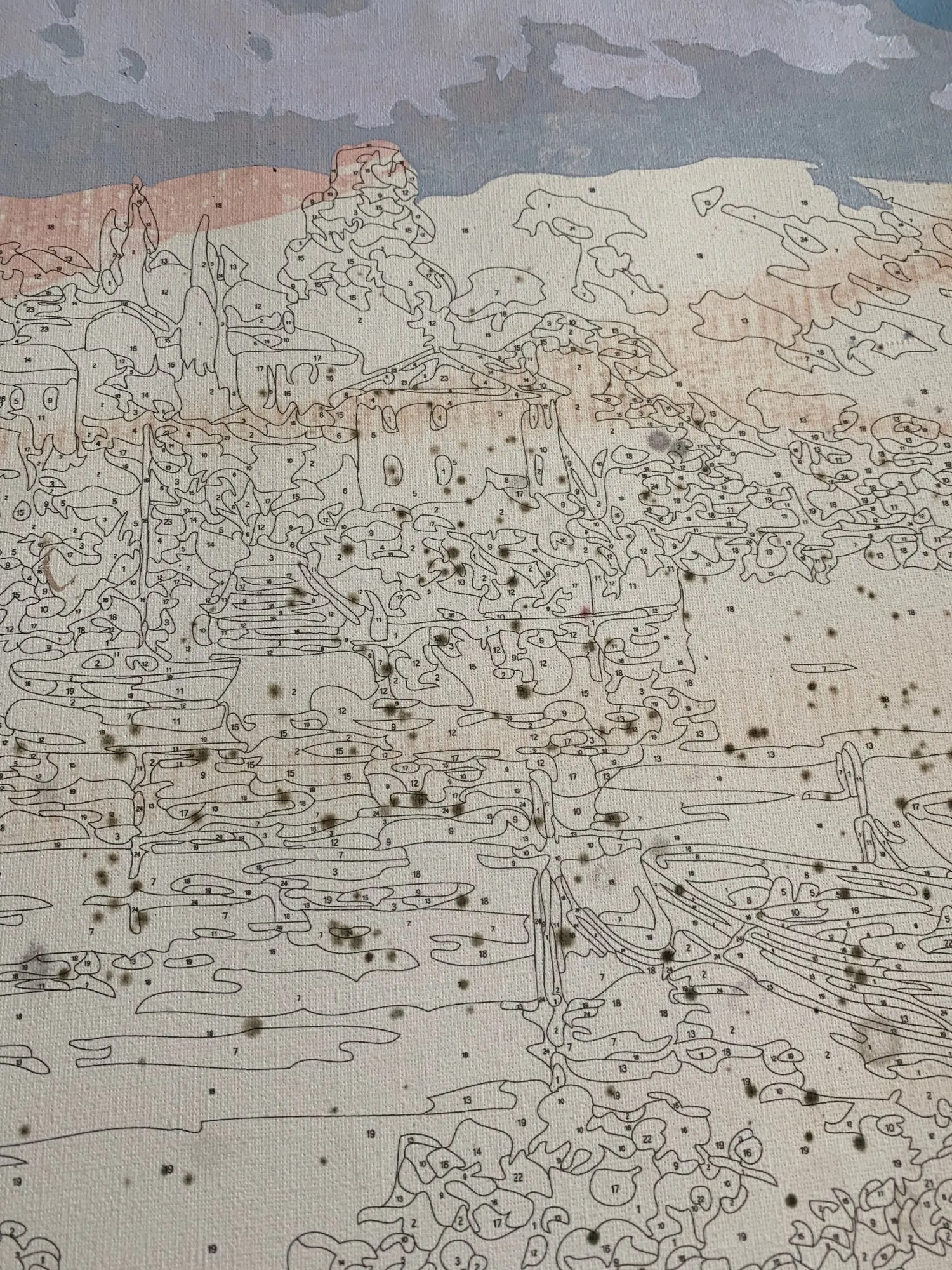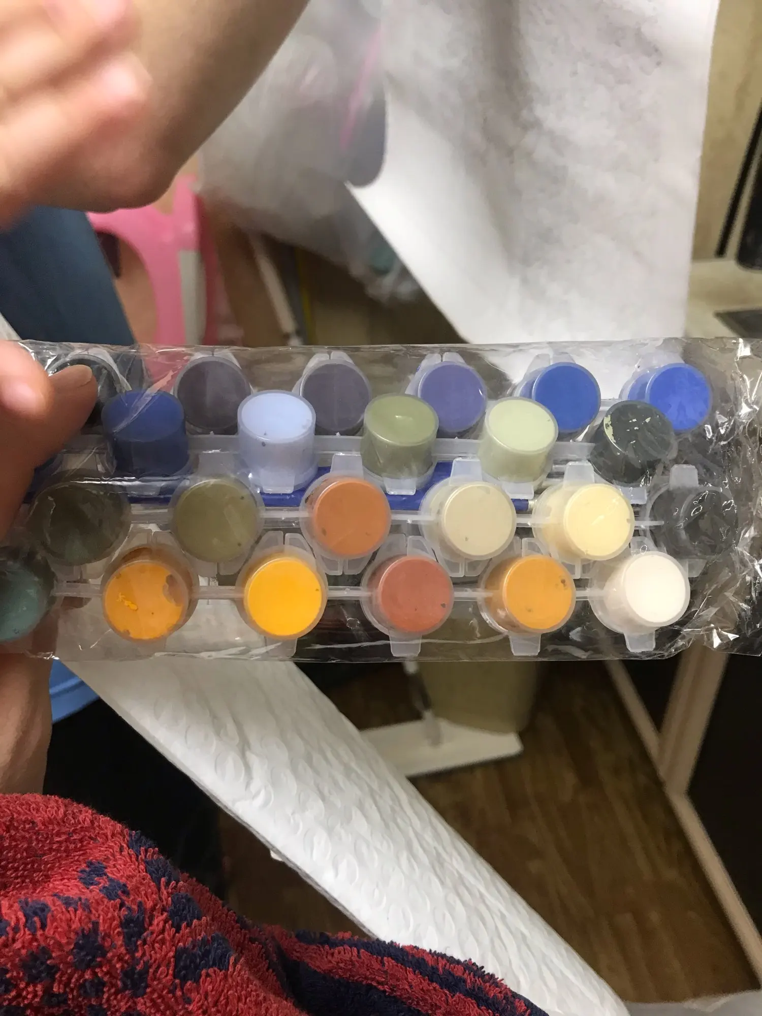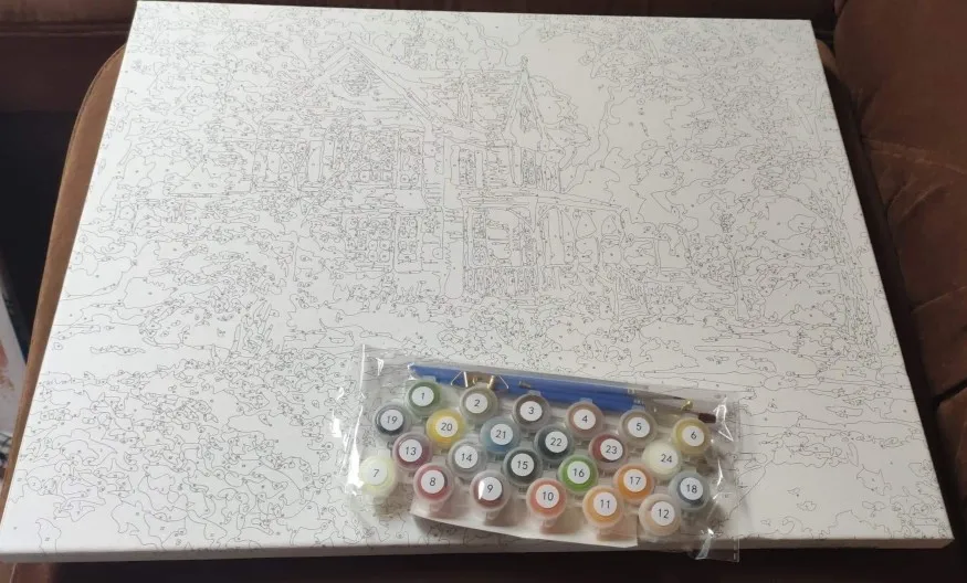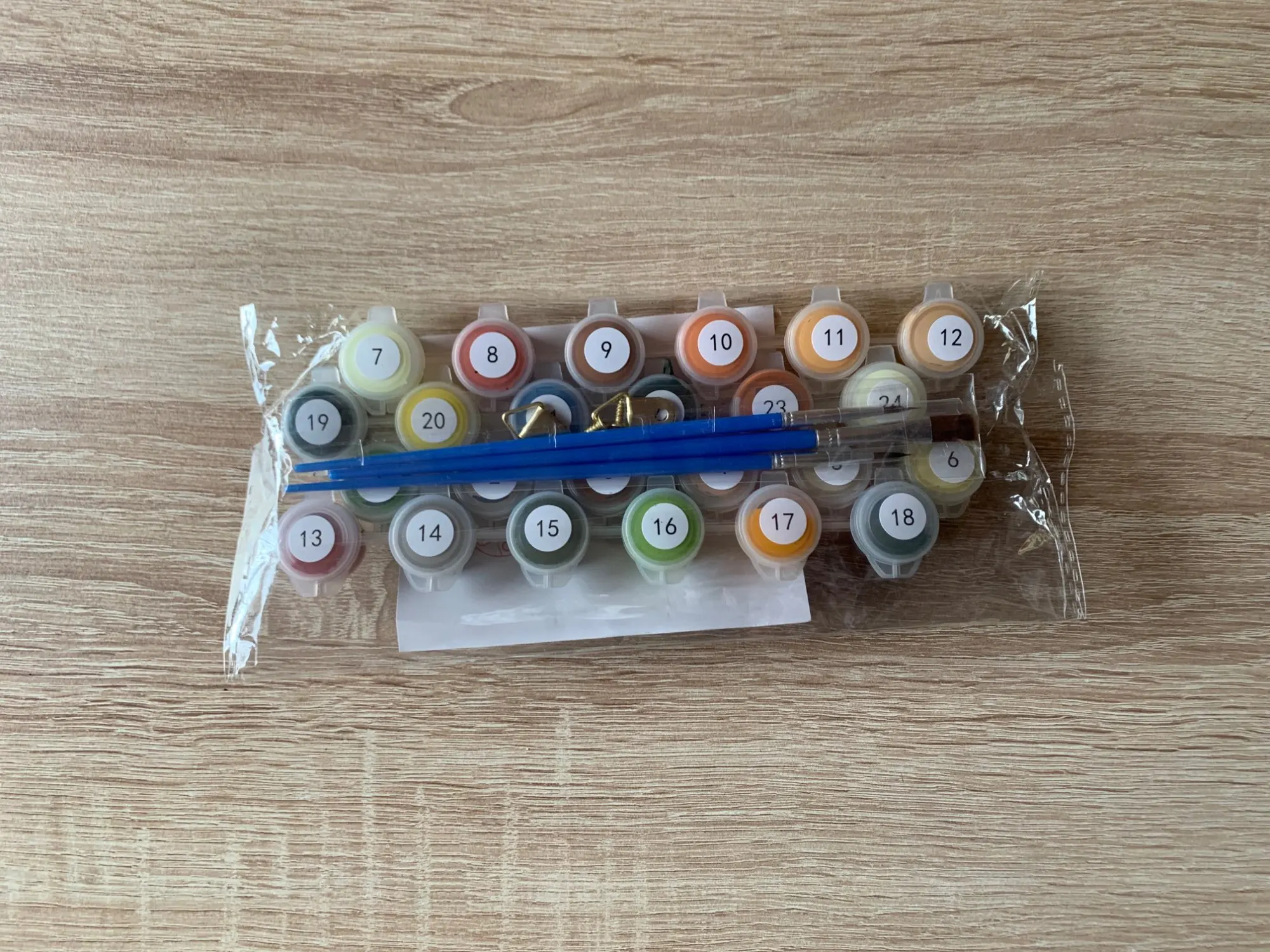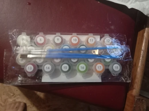 Всем очень довольно. Все упаковано очень хорошо, нигде ничего не повредилось. Краски хорошие, яркие, не высохшие. Кисточки тоже супер, 3 штуки в наборе. Сама картина четкая, номерки хорошо видно, не помята.