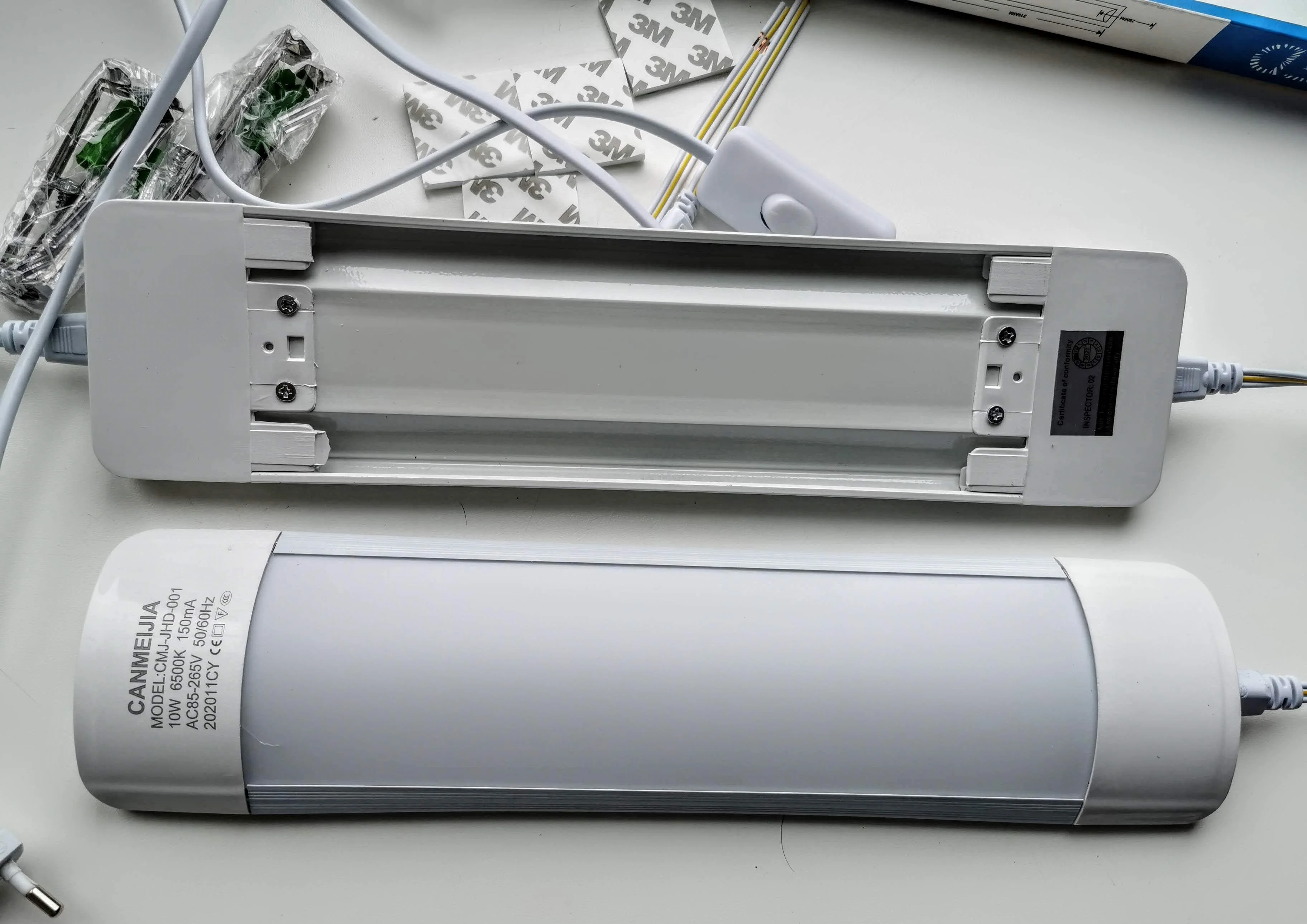Очень хороший светильник! В нашем доме это не первая лампа такого типа, так что есть с чем сравнить. Свет яркий, не холодный. Крепить буду под полку на скотч. В комплекте также есть саморезы, как вариант крепления и переходники на тот случай, если потребуется дополнительная лампа. Упаковка на отлично, приехала быстро, за 18 дней в Москву. Лампы достаточно, чтобы обеспечить ярким освещением площадь 9 КВ.м, возможно и больше конечно, но это площадь нашей кухни, для которой она и приобреталась:))). Рекомендую товар и продавца.