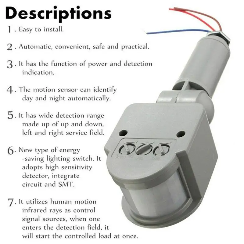 Открытый 110-220 В инфракрасный Pir датчик движения Детектор настенный светильникОписание Спецификация:Абсолютно новыйМатериал: АБС-пластикРабочее вращение: 140 °Напряжение: AC110V240V(50 Гц)IP Рейтинг: Внутреннее применение IP44Настройка Люкса: 0-2000lux svr регулируемаяВремя индукционного освещения: 5s5min регулируемое времяРасстояние обнаружения: около 12 м, установка 1,5-2,5 мВыход: 50 ВтРазмер: прибл. 4,5*5,5*15,5 см (Д * Ш * Г * В)Этот продукт является новым типом энергосберегающего переключателя освещения, он принимает высокий детектор с настройкой чувствительности, интегральной схемы и SMT, безопасный и практичный.Особенности:Простота установкиАвтоматический, удобный, безопасный и практичный.Индикация мощности и обнаружения.Датчик движения может автоматически распознавать днем и ночью.Широкий диапазон обнаружения: состоит из вверх и вниз, левой и правой области обслуживания.Он использует инфракрасные лучи движения человека в качестве источников сигнала управления, когда человек входит в Поле обнаружения, он начнет контролируемую нагрузку сразу.Посылка включает в себя:Настенный светильник с датчиком движения-1 шт.Примечание:Допускается погрешность в 1-2 см из-за ручного измеренияЦвет товара, отображаемый на фотографиях, может немного отличаться на мониторе вашего компьютера, так как мониторы не откалиброваны так же