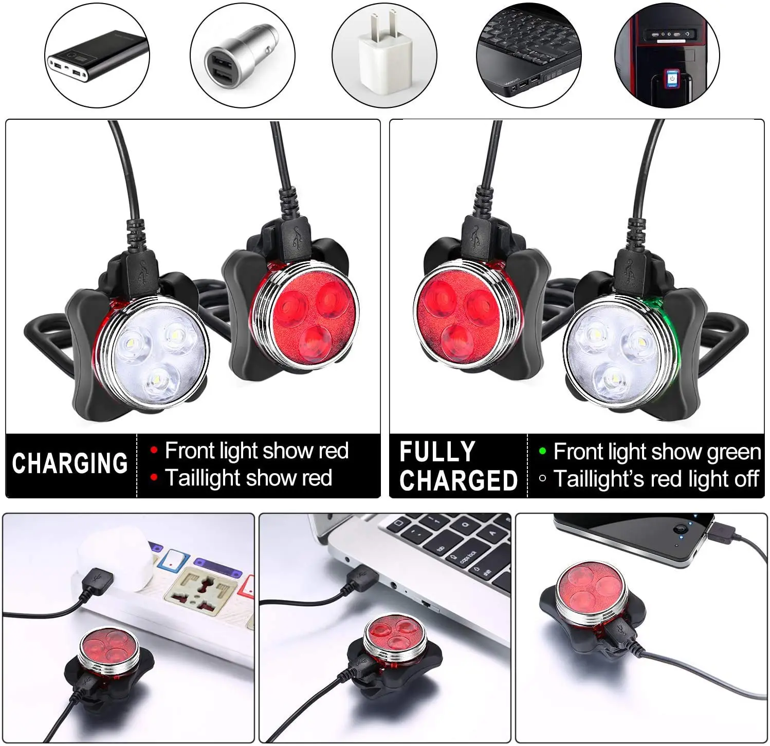 USB Перезаряжаемые велосипед светильник набор, супер яркий спереди головной светильник и задний светодиодный велосипедный светильник, 650 мАч, литий Батарея, 4 светильник режим
