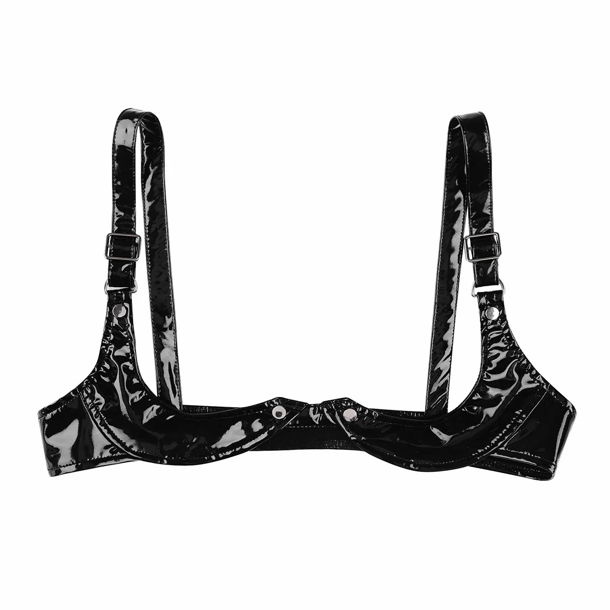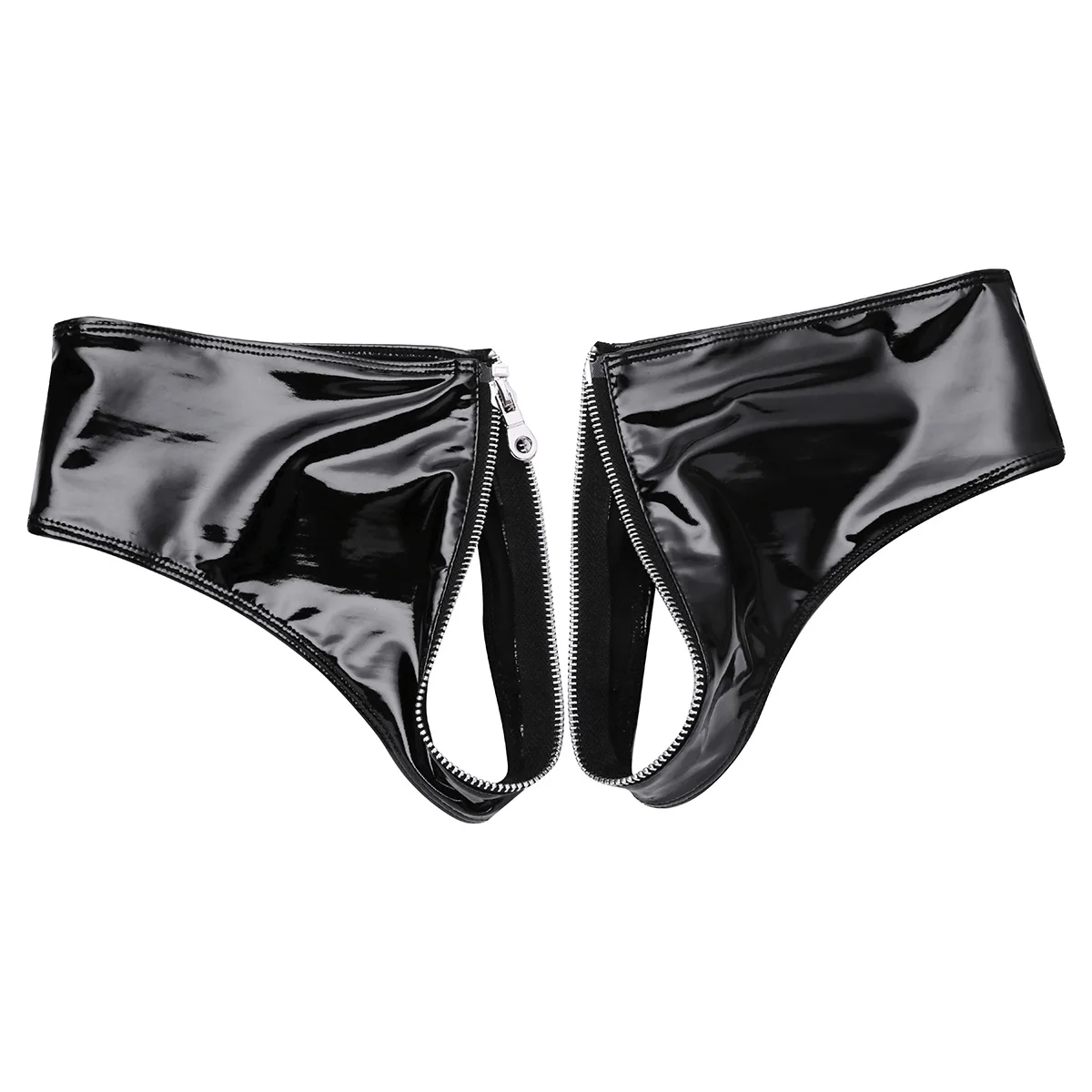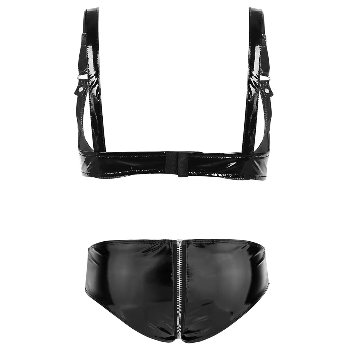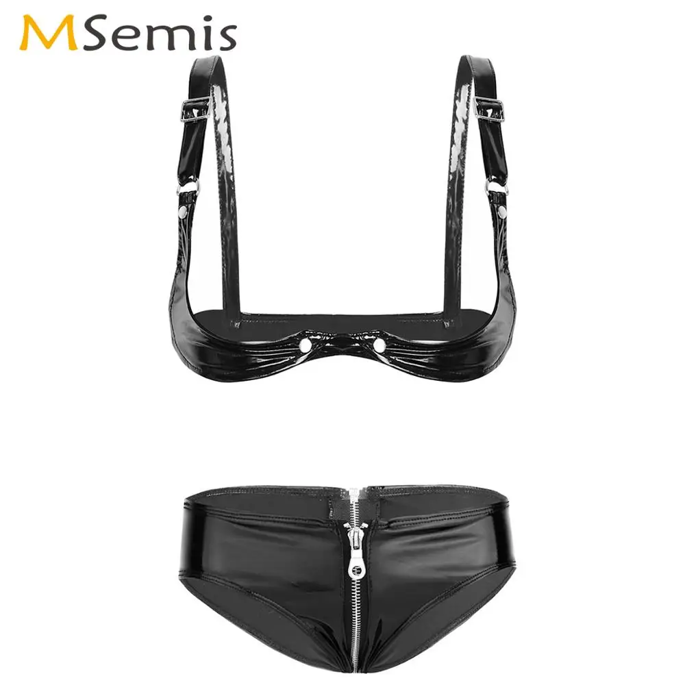 Msemis Женский комплект нижнего белья из кожи с эффектом мокрого вида, Эротический бюстгальтер с открытой полкой и застежкой-молнией, Сексуальные Трусики-бикини для танцев на шесте