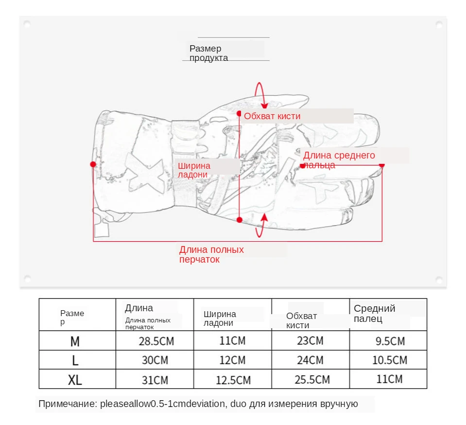 Не удобные перчатки , большой палец не удобно , рука полностью не открывается , не конформные,..., качество хорошая, брала для ребёнка 13 лет XL маленькие , не могу понять Польшы в перчатки длинные , но всё равно плотно не сидит на руке , как будто бракованный. Попросила продавцу сделать скидку , чтобы купить другой размер XXL , продавец не сделал
