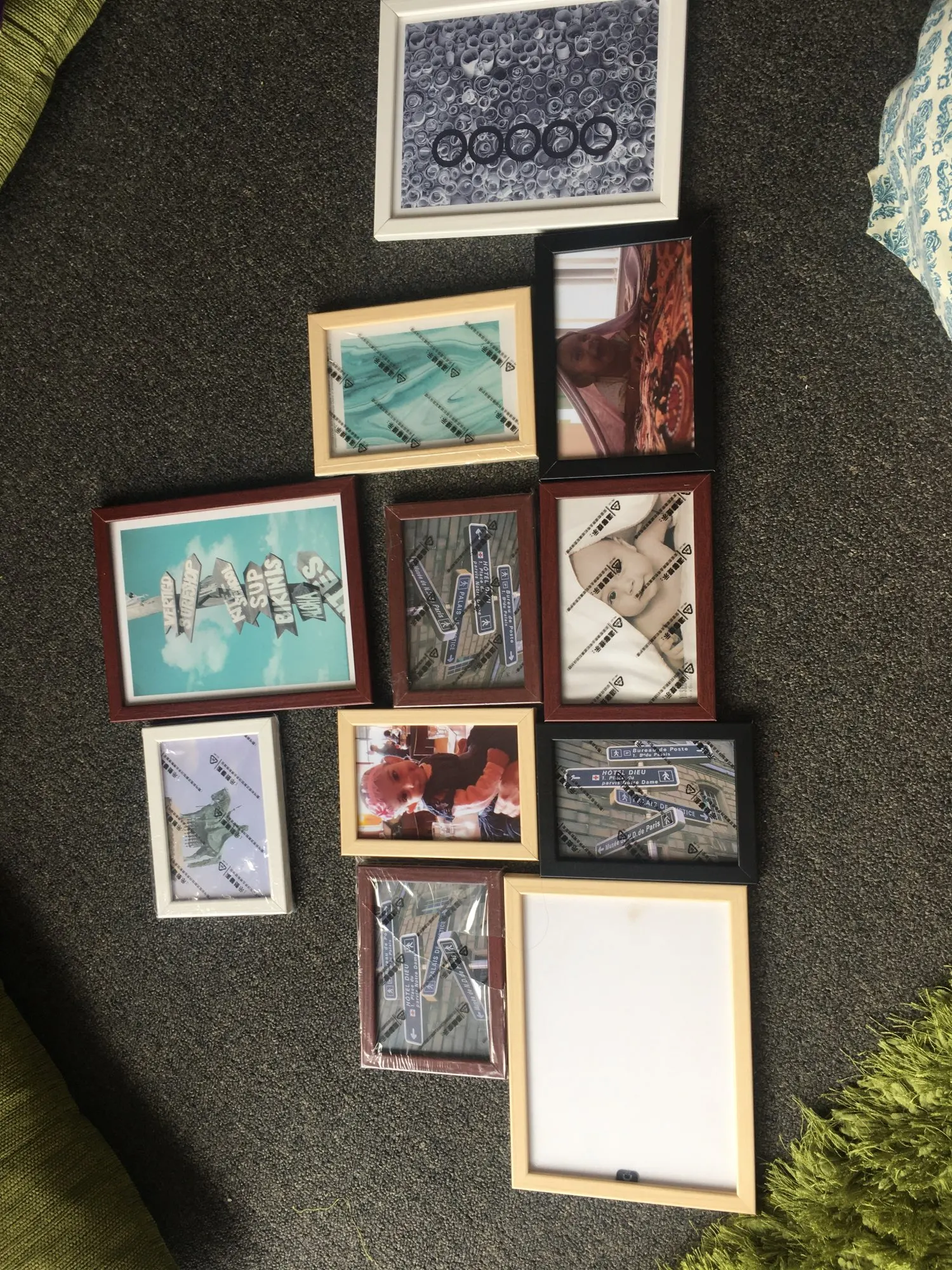 Посылка комплект входит 11 рамок для картин, что позволяет разместить их регулярно.