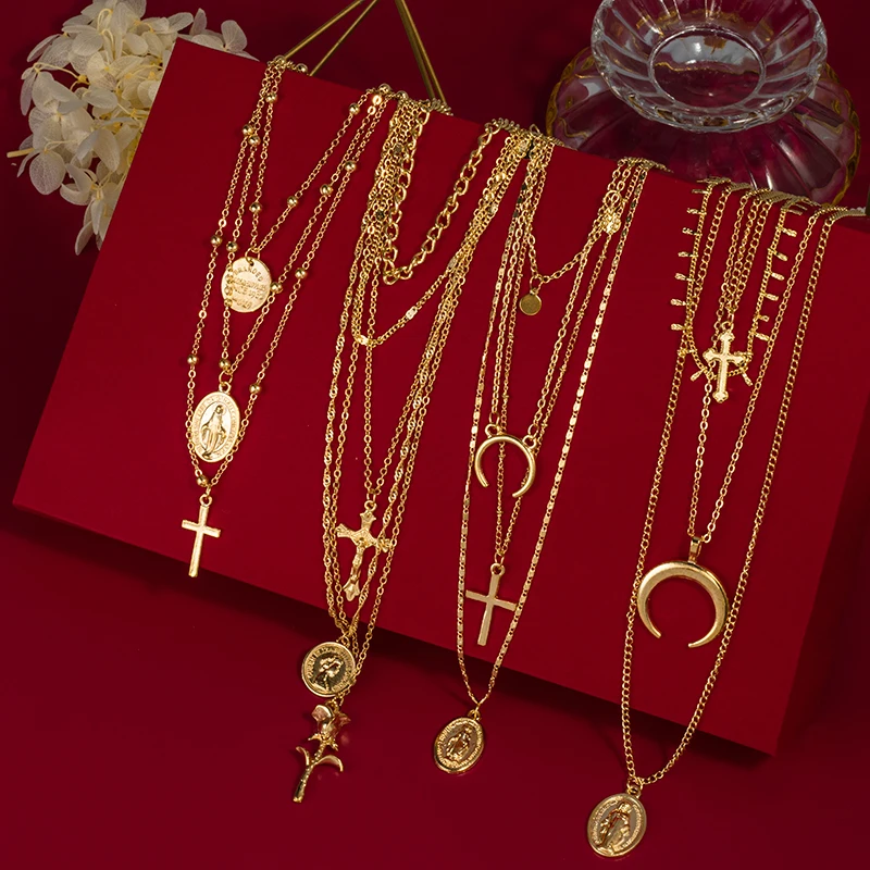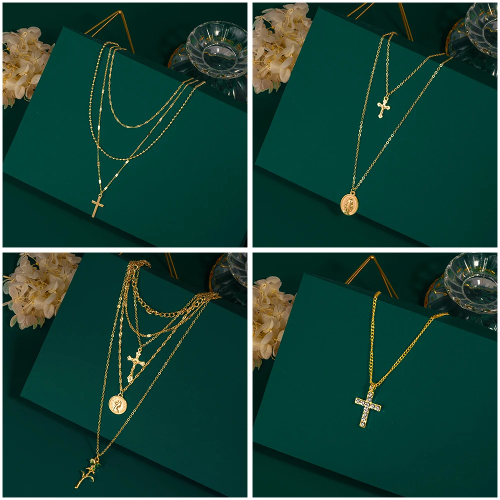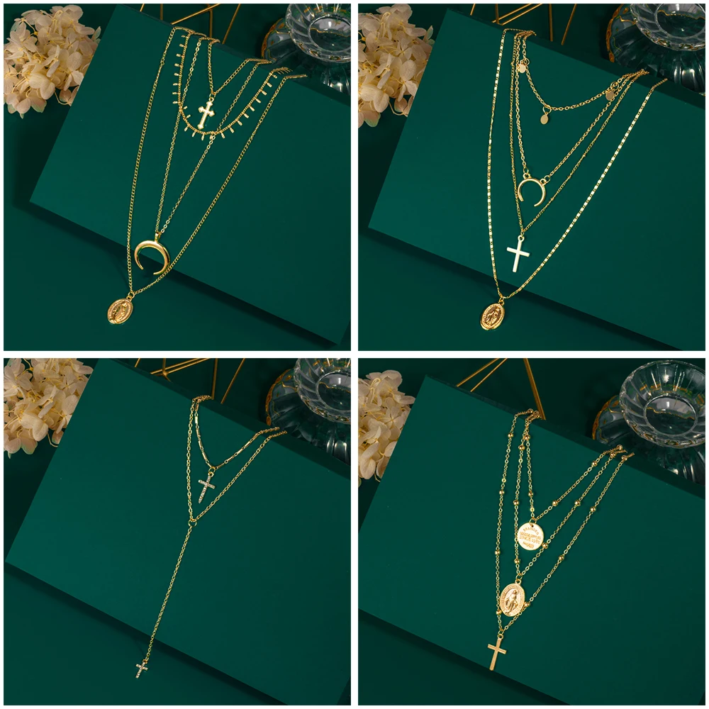 Ожерелье многослойное с крестом для мужчин и женщин, золотое ожерел...
