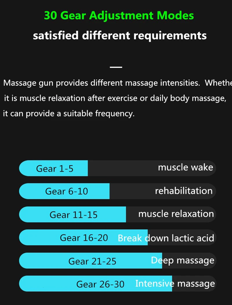 -ЖК-дисплей HD: ЖК-дисплей HD. Сенсорные кнопки. Точный дисплей положения шестерни, мощности и переключателя. 30 скорости вибрации регулировки. Эффективный массаж для расслабления мышц.