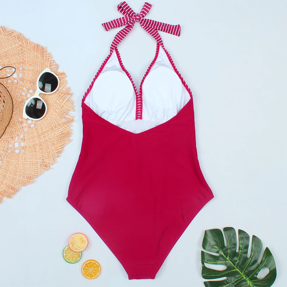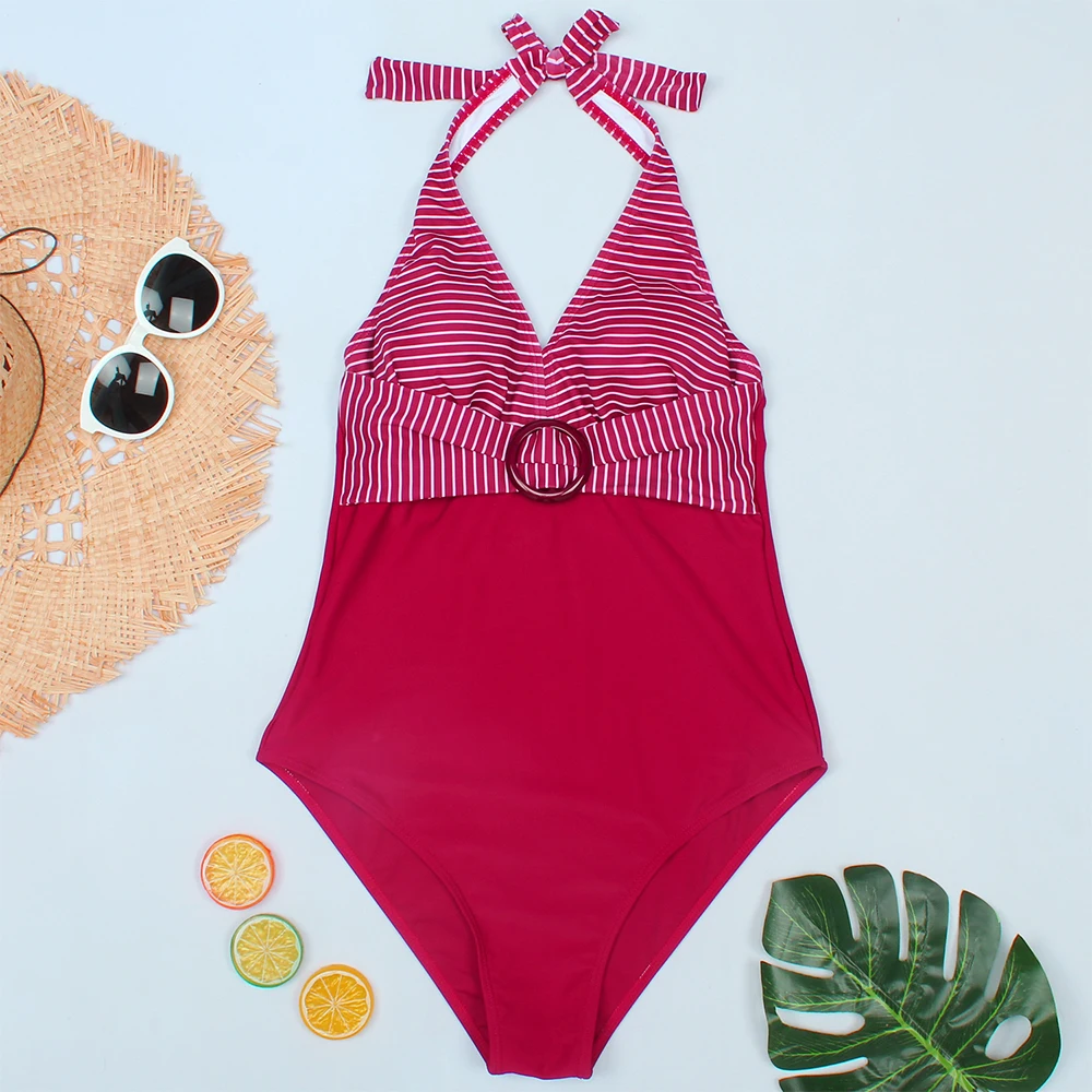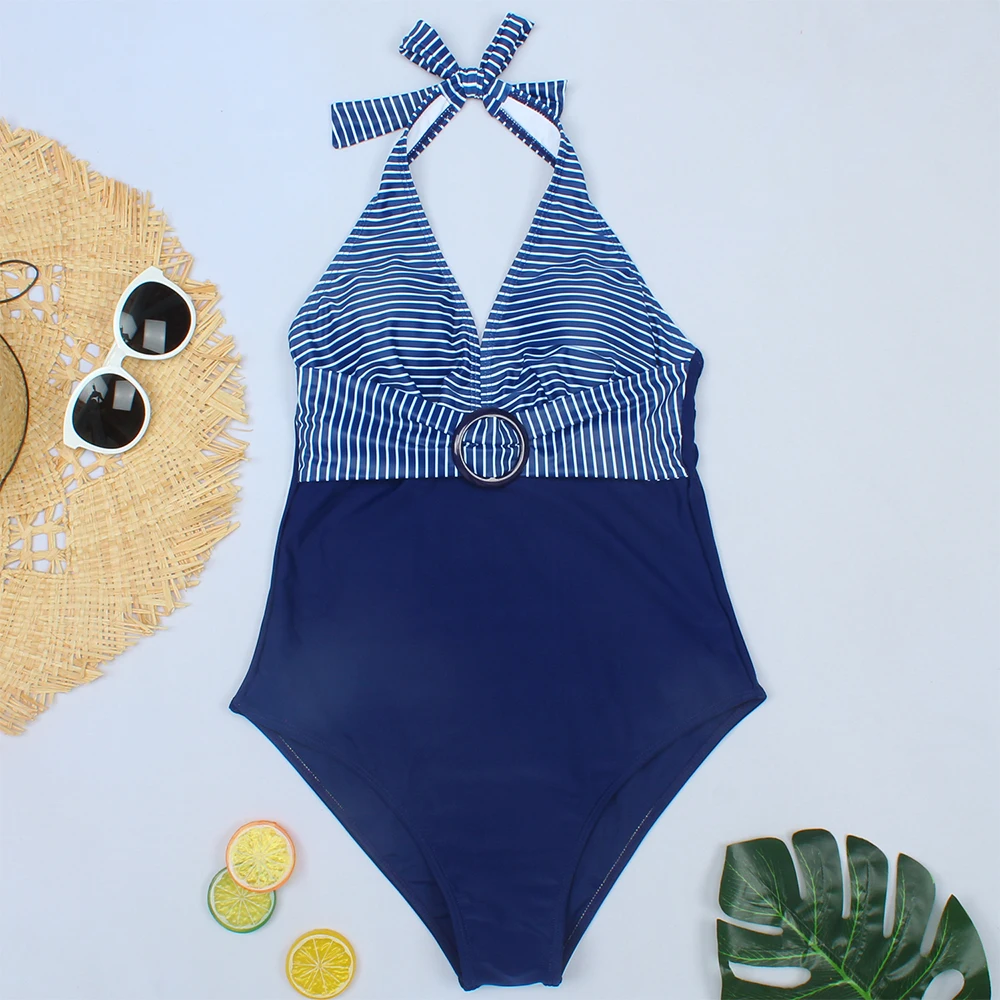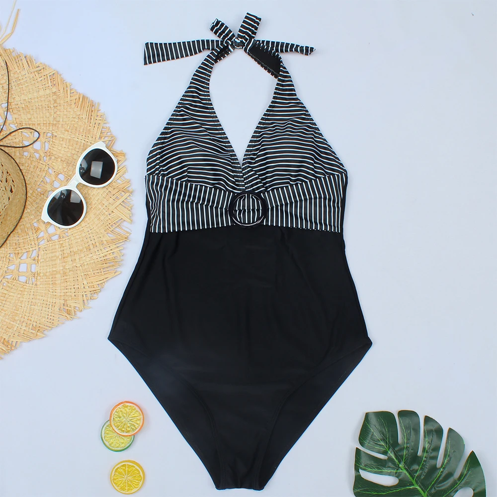 2022 сексуальный цельный купальник с лямкой через шею, женский купальник в полоску, лоскутный купальник, винтажный Ретро купальник, летняя пляжная одежда