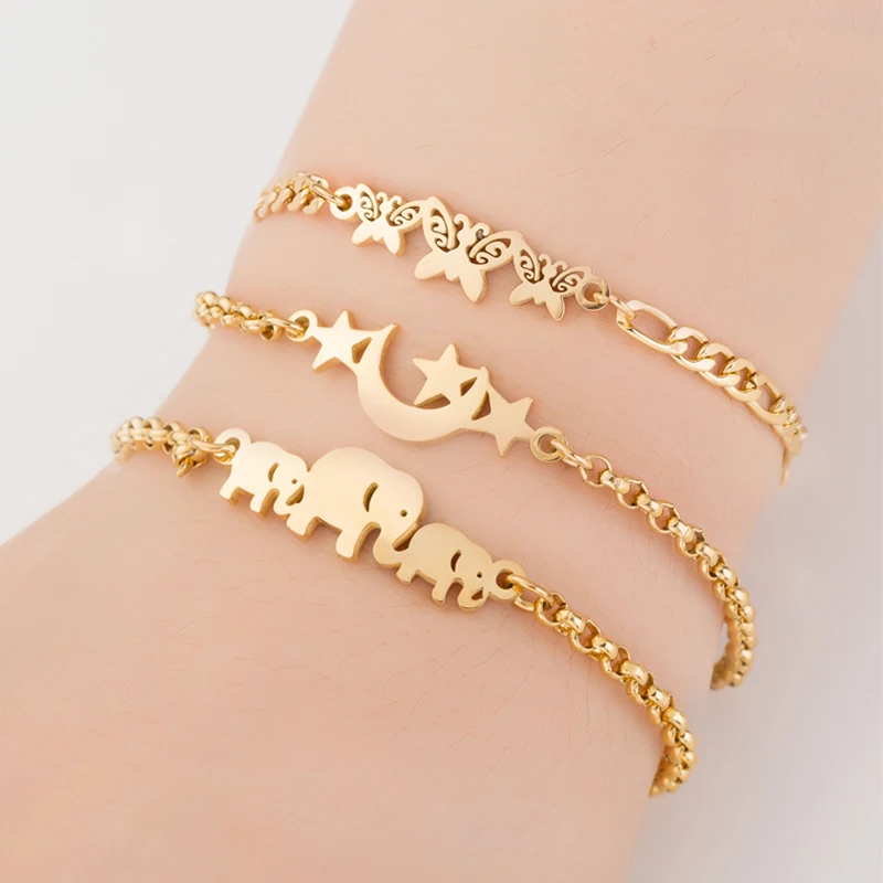 Очаровательные браслеты из нержавеющей стали для женщин милые Луна Звезда Бабочка Браслеты со слоном Браслеты золотого цвета ювелирные изделия Pulseria