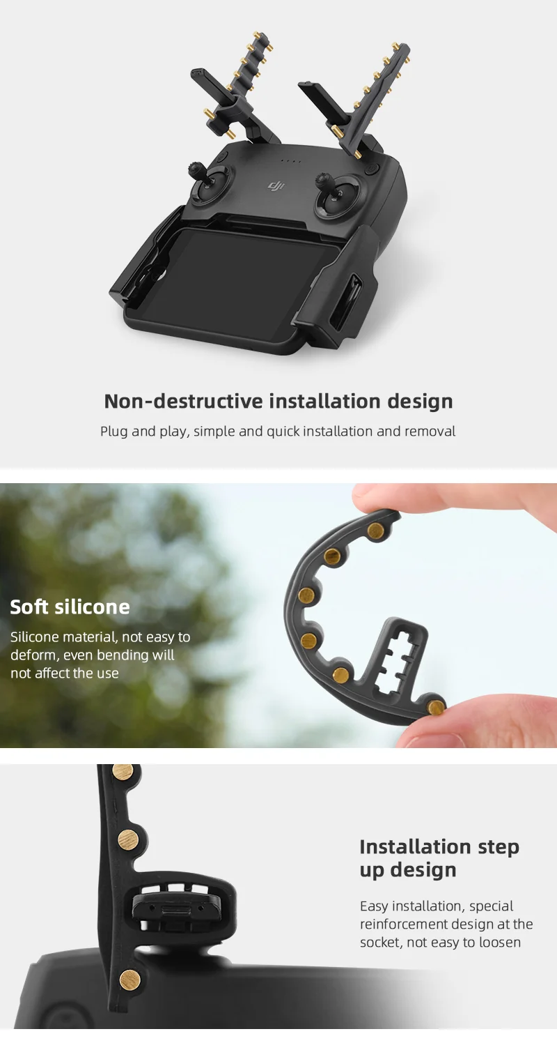 1. Изысканный и компактный, легко носить с собой, Медный столб и силиконовый материал, это не повлияет на использование после изгиба,2. Улучшите сигнал дистанционного управления, чтобы эффективно продлить расстояние полета,3. Подключи и работай, простая и быстрая установка и разборка, неразрушающая конструкция установки,4. Защита пленки, защита от отпечатков пальцев, пыли, царапин,5. Поверхность имеет специальный эффект, очень хороший отражающий эффект, улучшенный сигнал.