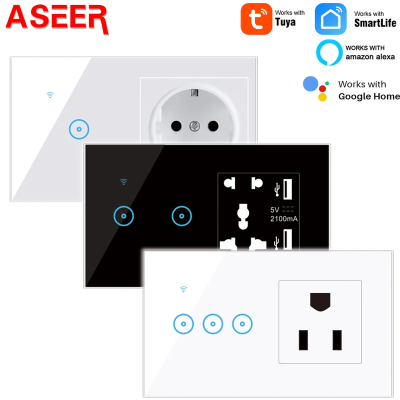 ASEER TuyaEwelink 1-2-3 банды WiFi смарт-переключатель с гнездом Хрустальная стеклянная панель 90 250 В ЕС США розетка, Великобритания двойной USB разъем, alexa