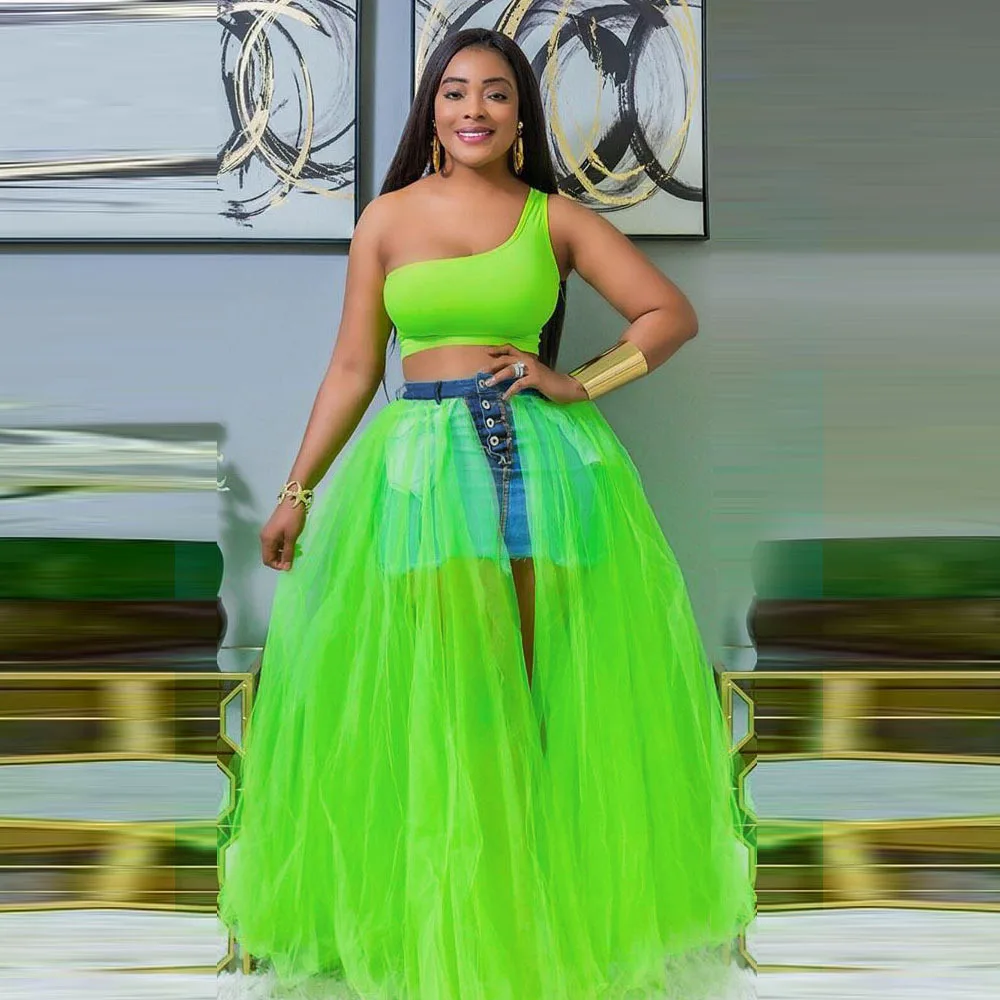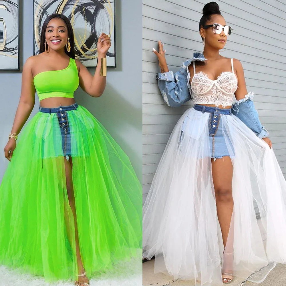 Женская юбка из денима и фатина, длинная юбка в готическом стиле с разрезом, в стиле Харадзюку, белого, неонового, зеленого цветов, 2020