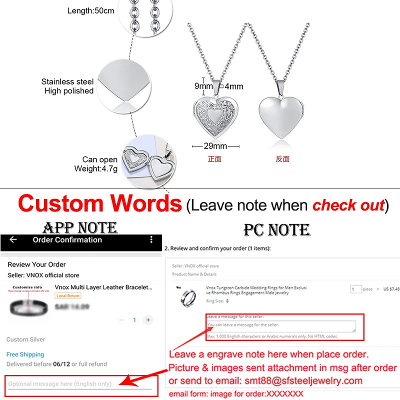 3. Могу ли я добавить свой собственный логотип?Да4. Сколько времени потребуется на изготовление ювелирных изделий?Обычно мы отправляем в течение 48 часов (время работы)8. Как отметить текст и изображение?Укажите номер изображения внутри ().Например: черный шрифт 50, гравировка: Lucy (165) навсегда.Ваш собственный образ, пожалуйста, отправьте вложение в сообщении или отправьте на электронную почту: smt88 @ sfsteeljewelry