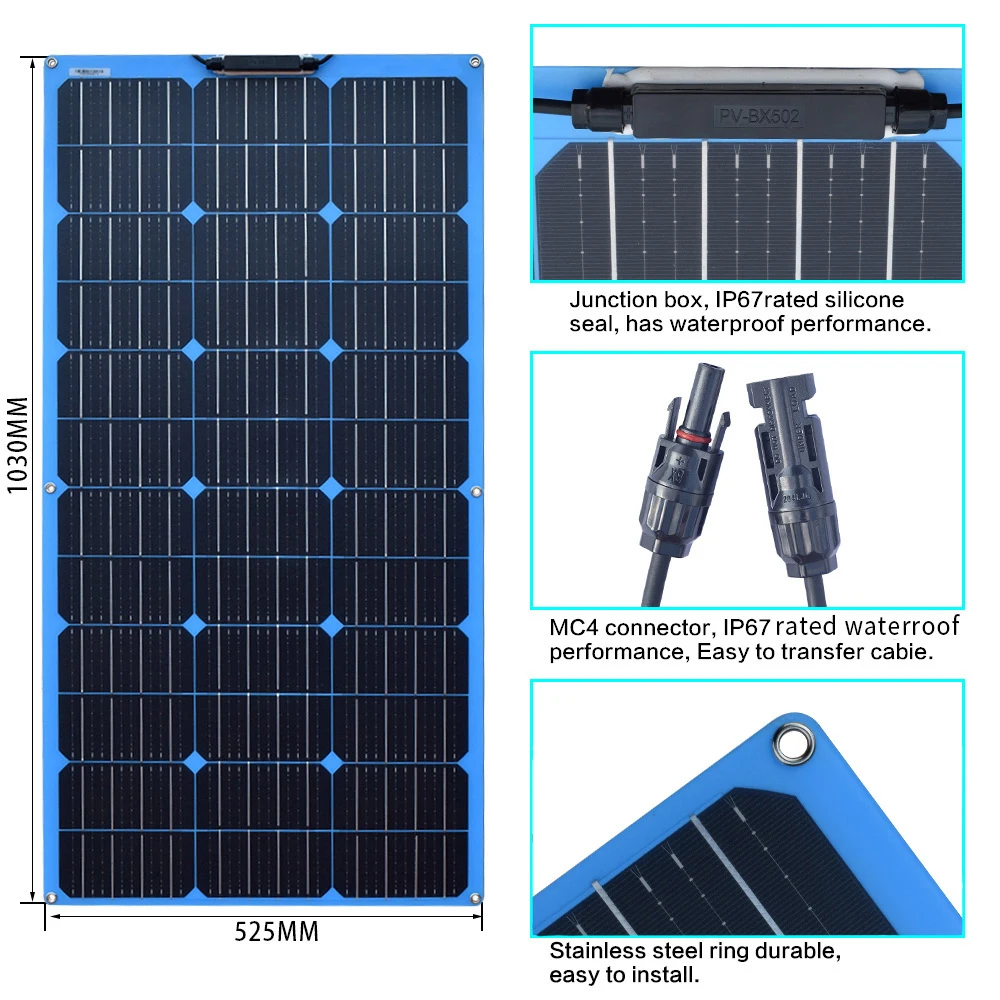 Солнечная панель 100Вт, гибкая, с зарядным устройством батарей 12В, монокристаллическая, для домашней системы 1000Вт, для использования в машине, на лодке, в кемпинге