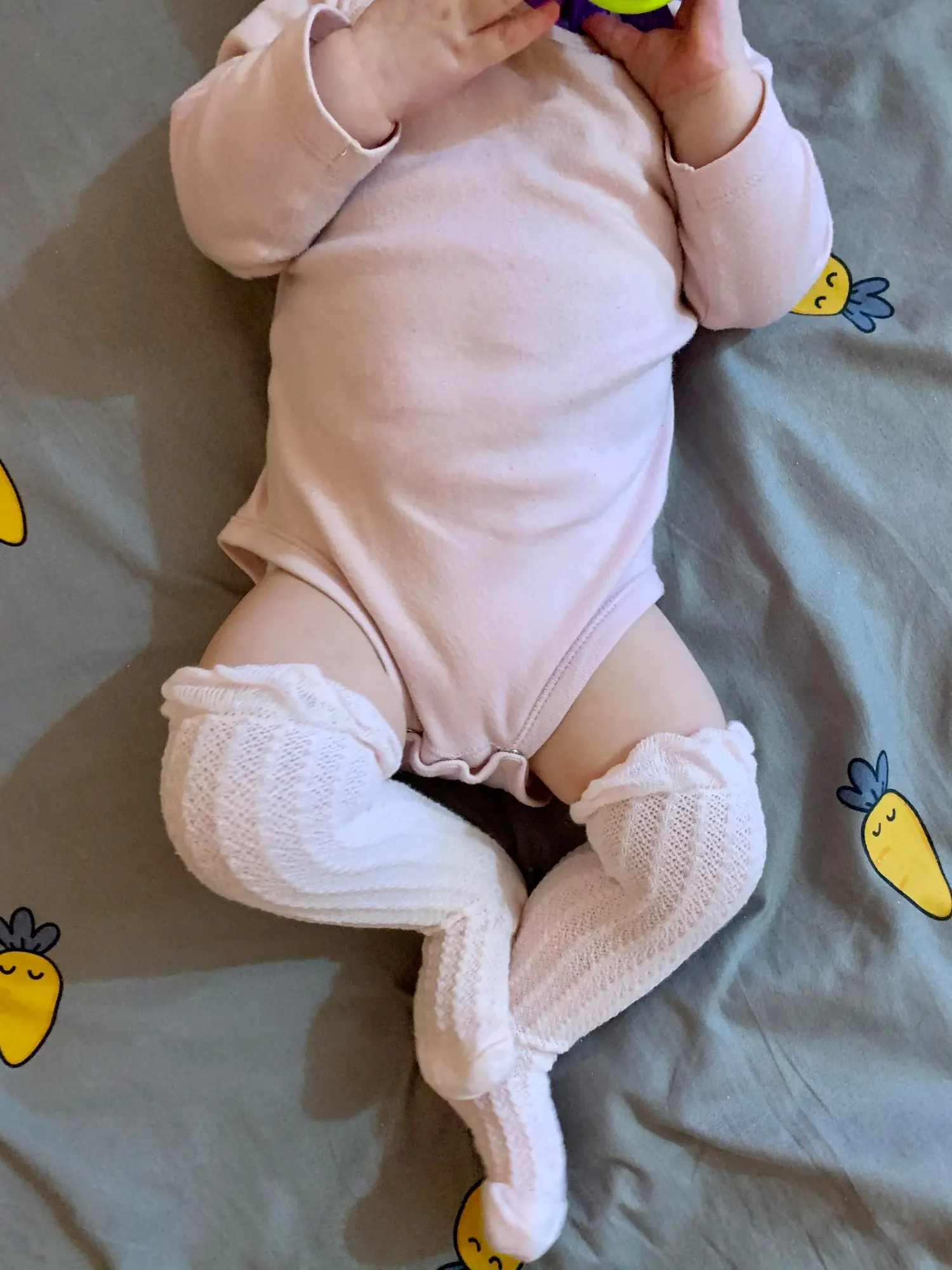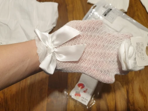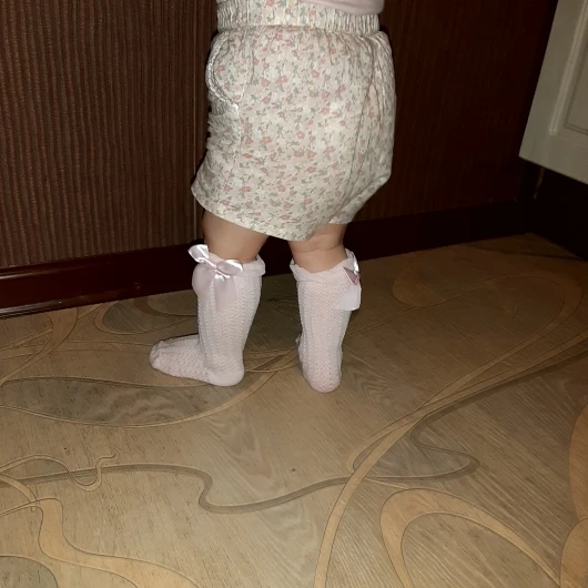 Дочке полгода, гольфы ей немного великоваты, к весне как раз, думаю, наденем. Мягкая сеточка, милые бантики. Очень красивые!