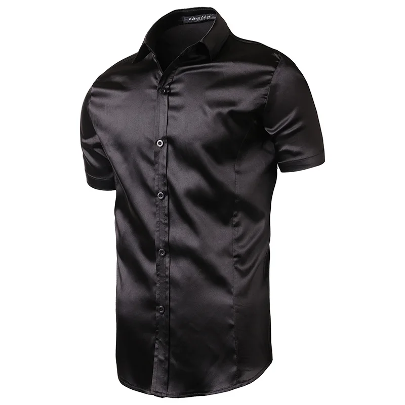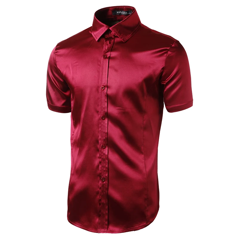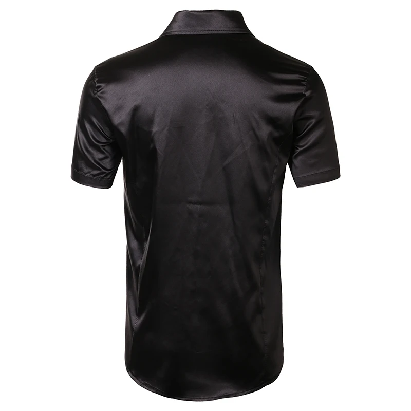 Гладкая шелковая атласная рубашка для мужчин, новинка 2022, Брендовые мужские рубашки с коротким рукавом, повседневные тонкие вечерние блестящие рубашки для свадьбы, выпускного вечера, Homme XXL