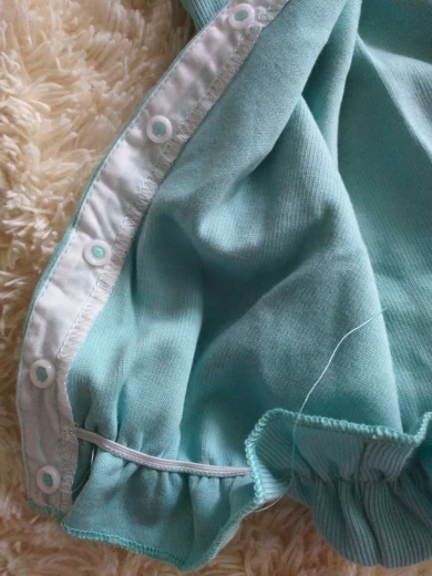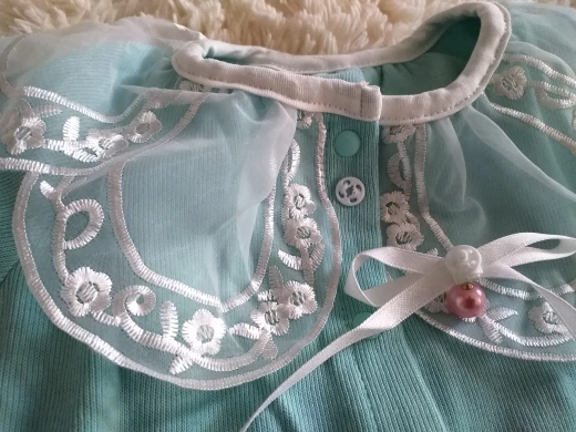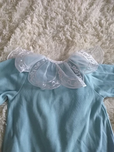 Комбинезон неплохой, пошит качественно. Немного огорчило что ткань не натуральный хлопок, с примесью синтетики, тянется. Довольно плотный материал. Манжеты на резиночках. Цвет нежный, голубой. Воротник из плотного гипюра, не расползается, форму держит, очень аккуратный. Дополнительное украшение в виде бантика из ленточки и бусинки, съёмное, крепится на кнопку. В целом все отлично. Простой и в тоже время нарядный комбез. Рекомендую.