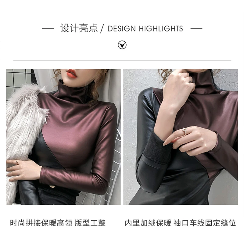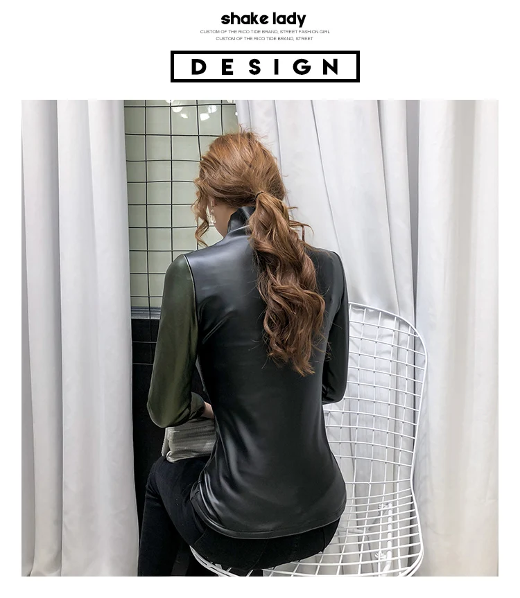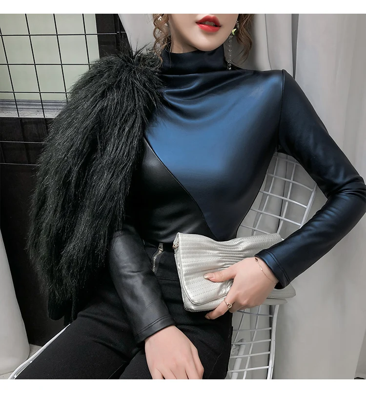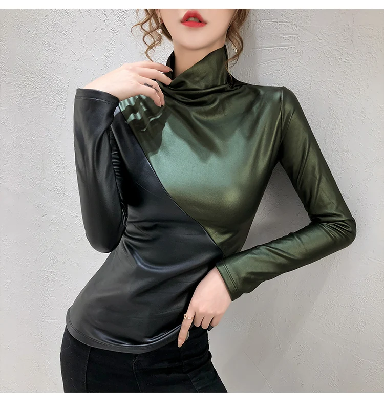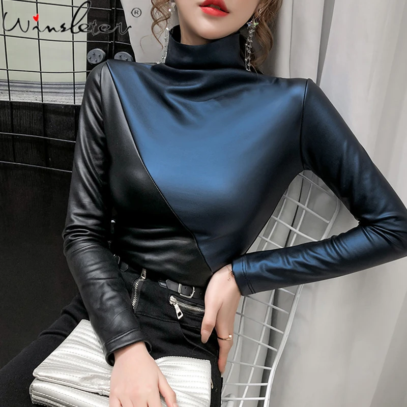 Женская Толстая футболка из искусственной кожи, с длинным рукавом и воротником-хомутом