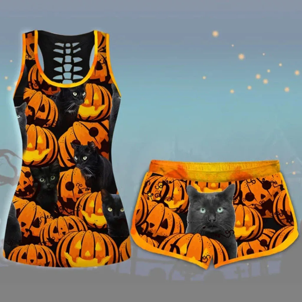Женский комплект из рубашки с коротким рукавом и принтом, комплект с шортами на шнуровке для Хэллоуина, женский новый летний короткий спортивный костюм с принтом, наряды 2020