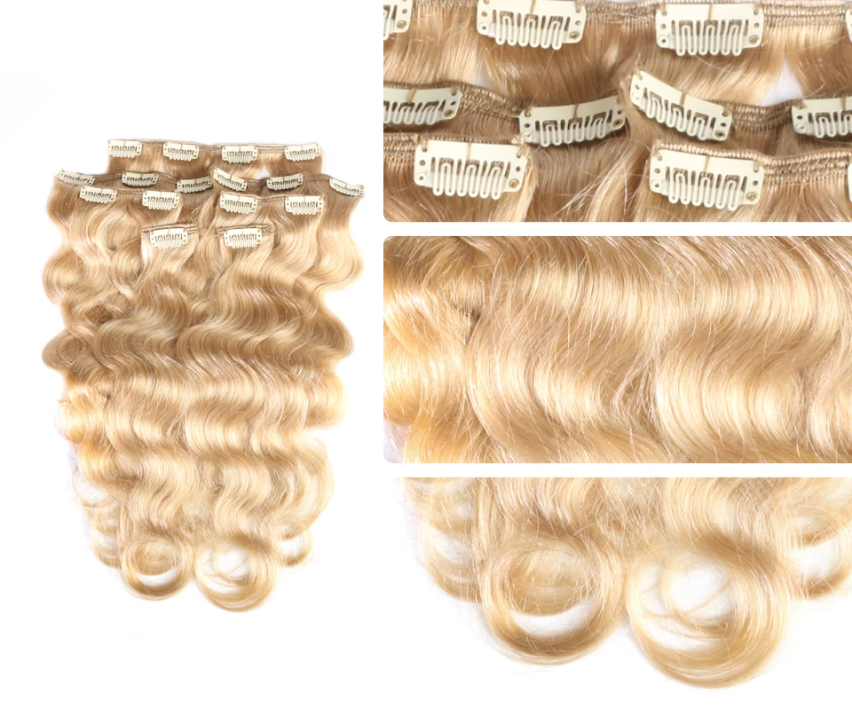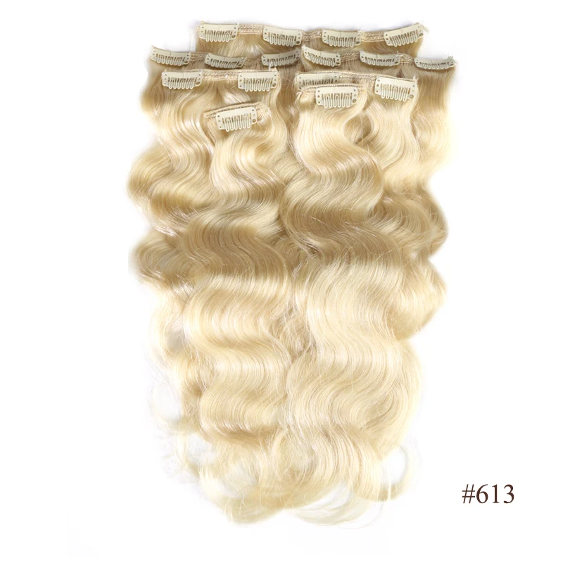 Зажим в Пряди человеческих волос для наращивания волнистые волосы фабричного производства Волосы Remy 120G #60 Блондинка 12 дюймов-24 дюйма натуральные кисточки, набор из 7 шт