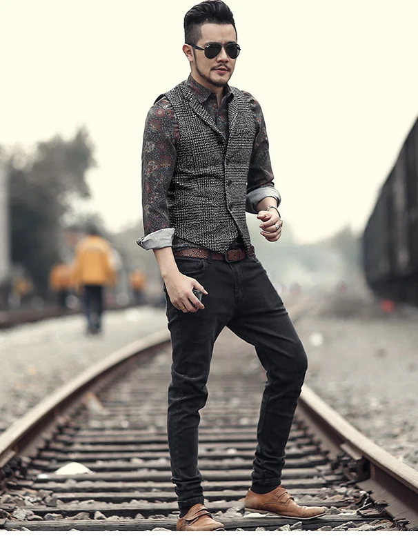 Серый шерстяной смокинг в елочку для жениха, 3 предмета, твидовый М...