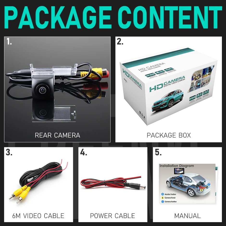 1. CVBS/AHD камера заднего вида2. Коробка для посылка3. Видео кабель 6 м4. Кабель питания5. Руководство пользователя