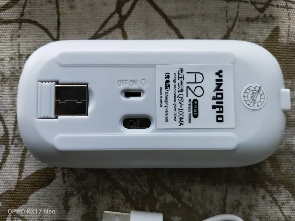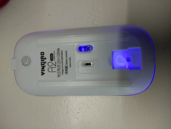 Очень жаль, что коробка пришла мятая, внутри мышка вся в царапинах, как будто ей уже пользовались. Рекомендую продавцу лучше упаковывать товар, в пупырчатую пленку например. Несмотря на это, я в восторге, мышка красивая, удобная, была заряжена. В передней части разъем для зарядки. Снизу в корпусе был usb штекер, правда его очень не удобно вытаскивать. Для сравнения положила рядом обычную мышку и новую (фото 3). В руке лежит удобно, поверхность матовая, не скользит, по началу было не привычно пользоваться, но за пару минут освоилась. Когда подключаешь шнур, под колёсиком горит третья голубая лампочка (цвет не меняет). Если мышкой не пользоваться, то она горит ещё пять минут. Удобно, что снизу есть тумблер, которым можно просто включить/выключить мышь, или выключить подсветку (но мышка при этом работает). Кнопки действительно очень тихие. В общем, пользоваться мышкой одно удовольствие, жаль только, что она вся в царапинах, за это минус одна звезда.