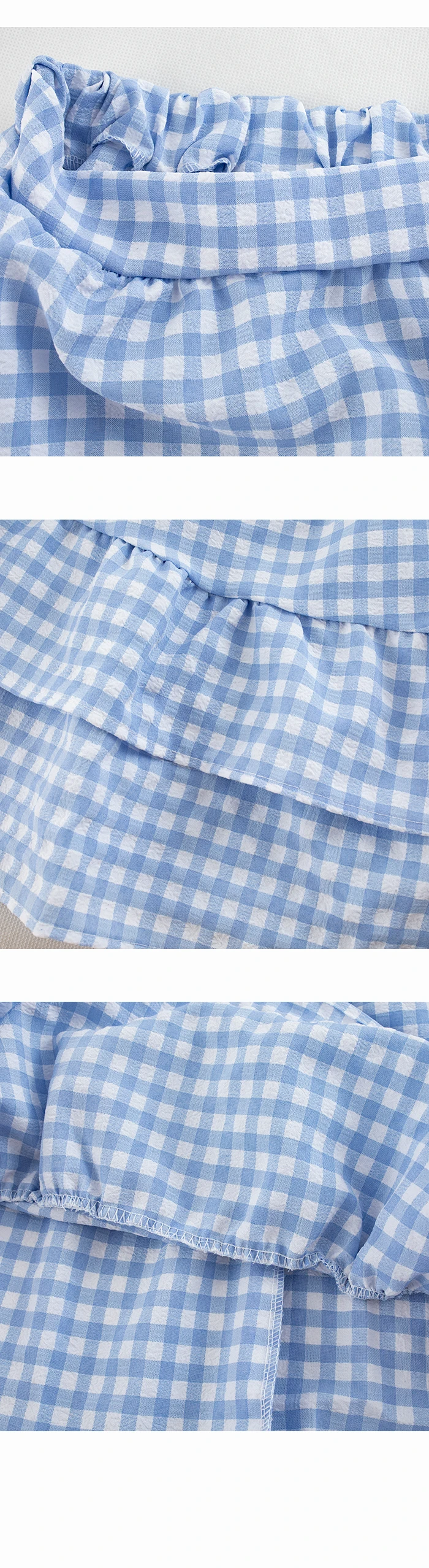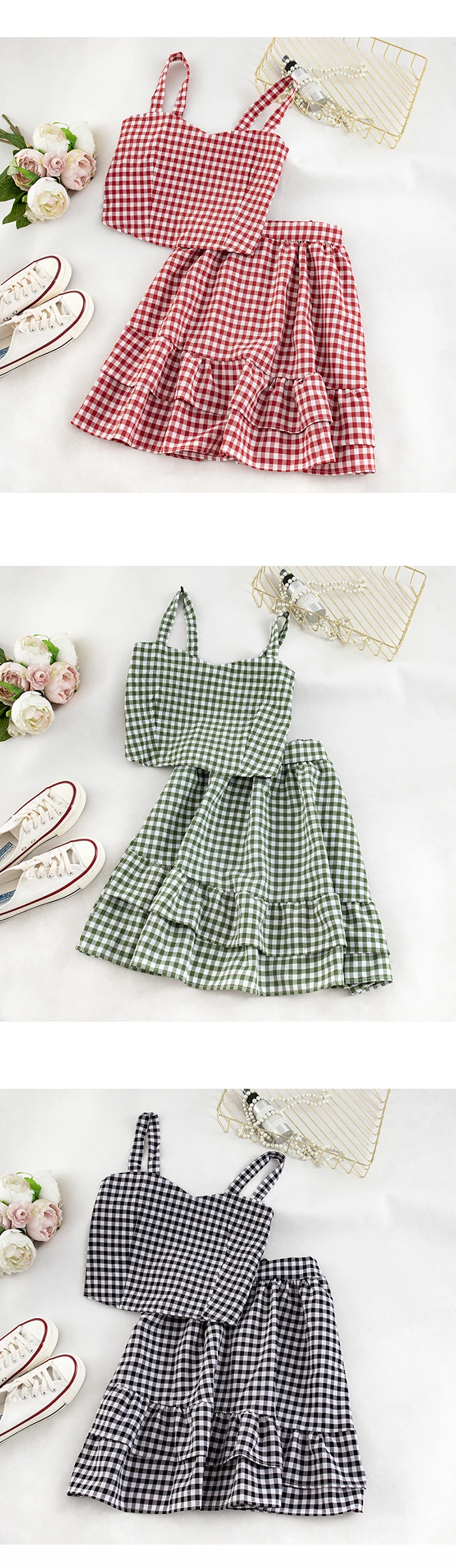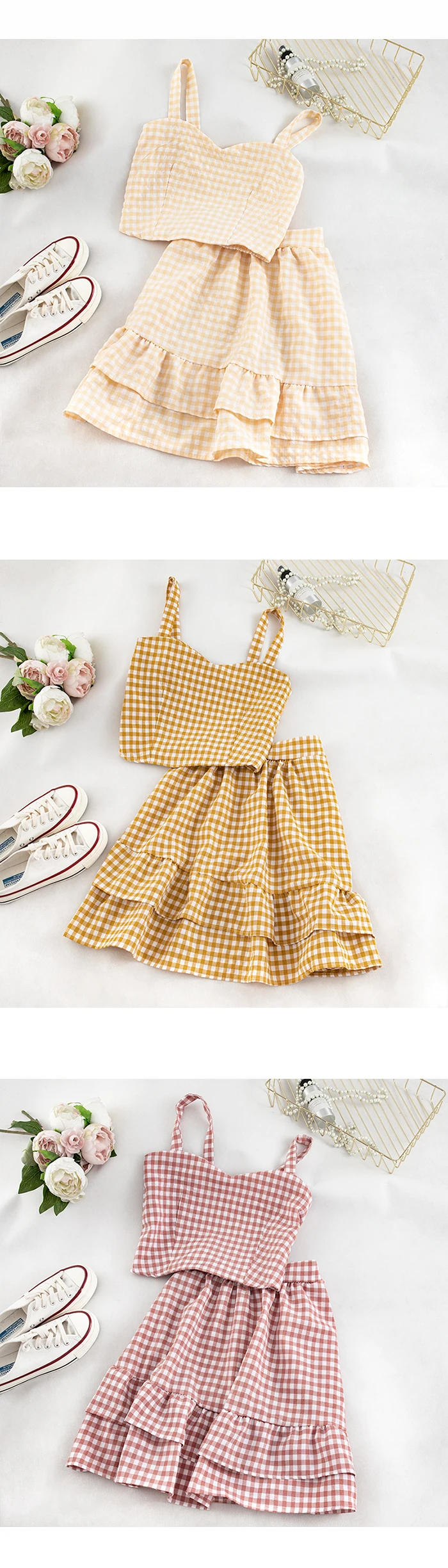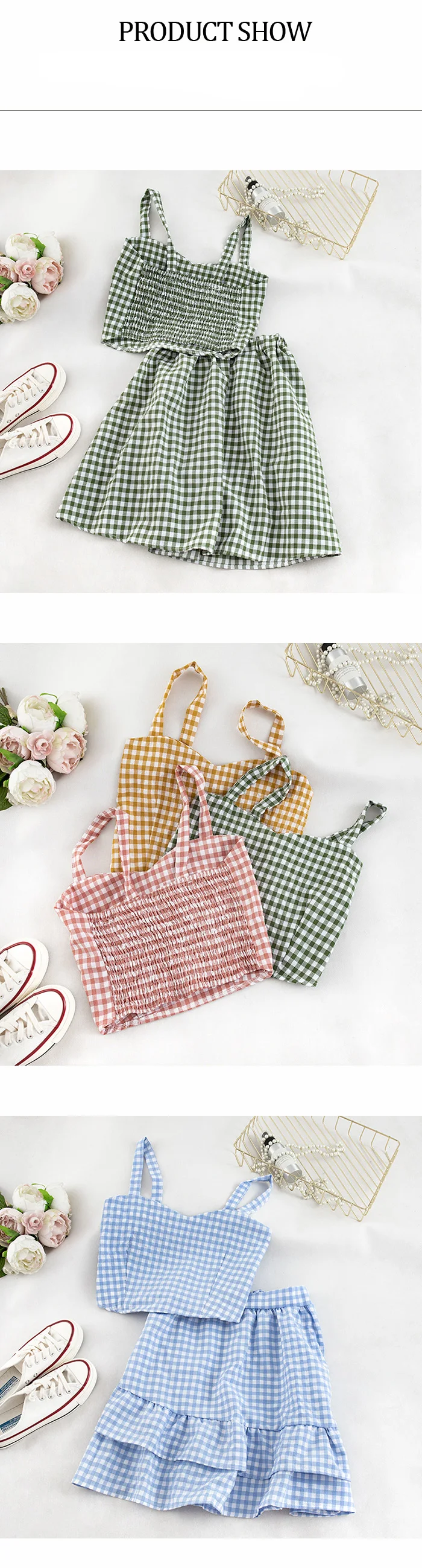 Женский костюм-двойка из эластичной юбки и мини-юбки, летний комплект, клетчатые Короткие топы