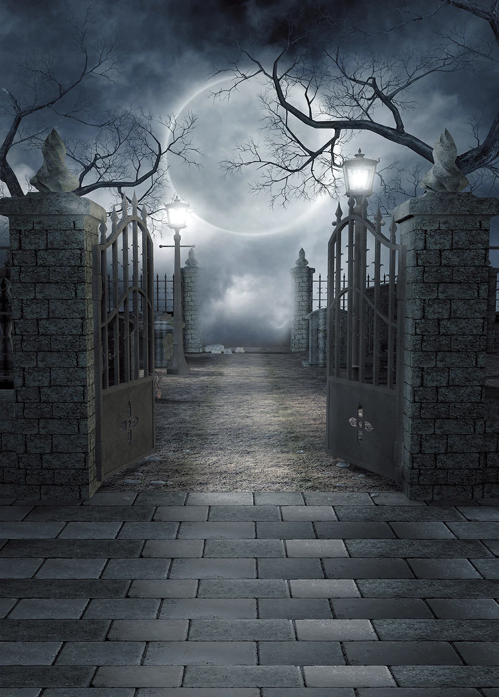 Фон для фотосъемки Хэллоуин с изображением таинственной двери ужасов ночей Луны маскарада