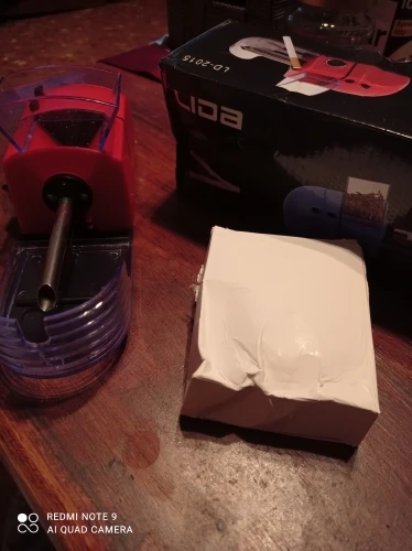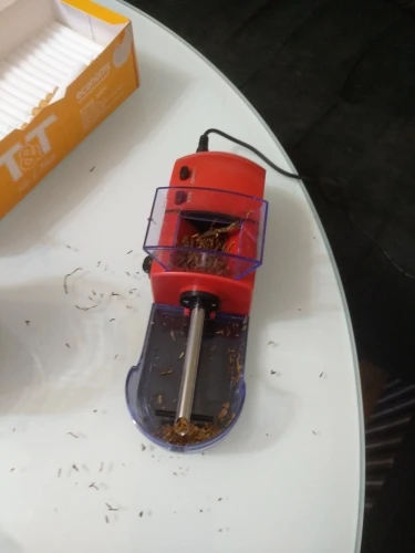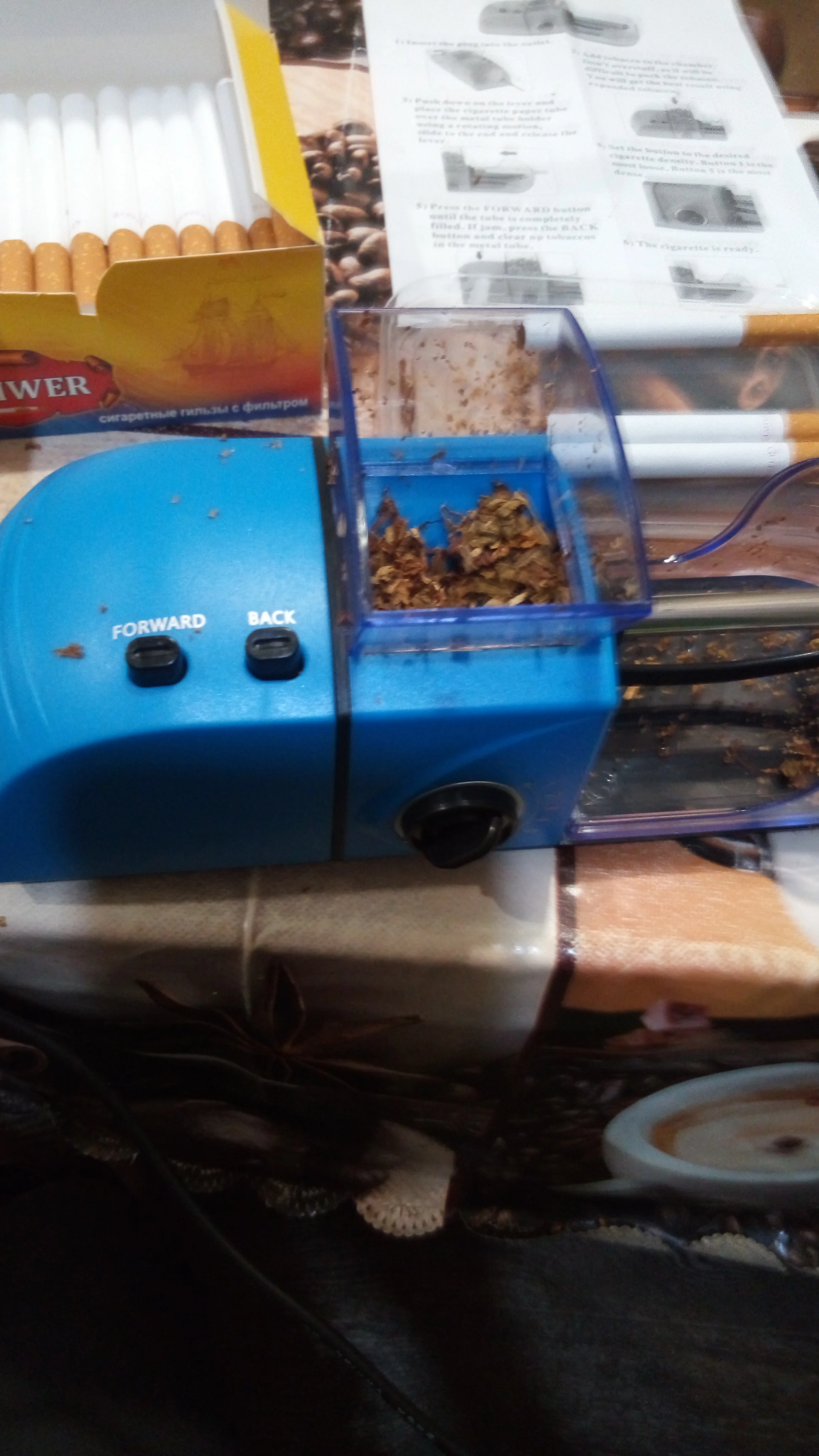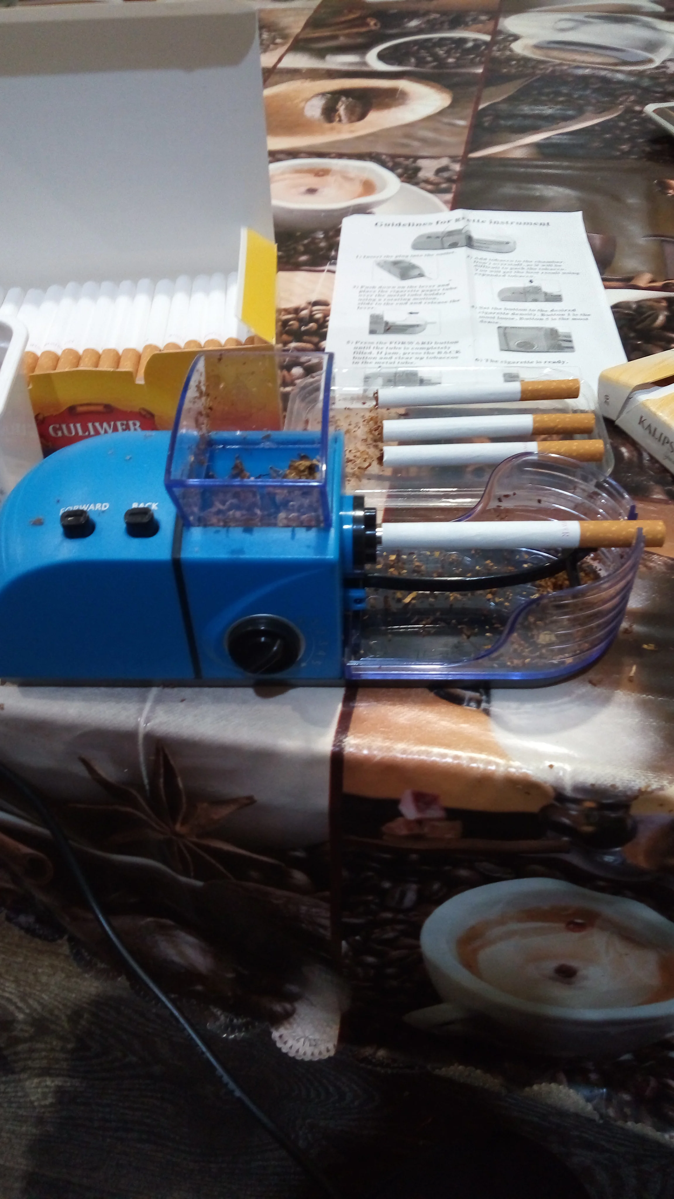Машинка сигареты набивает, но очень медленно. Ручной машинкой набивать и быстрее и проще. За время набивки одной сигареты этой машинкой, я успею минимум две сигареты набить ручной машинкой не напрягаясь. Ну и не сказал бы что она сильно облегчает процесс набивки. К тому же, она забивает гильзу табаком очень плотно, что ведёт к перерасходу табака и сигарету надо разминать перед курением. Ну и шумит она неприятно в процессе работы.