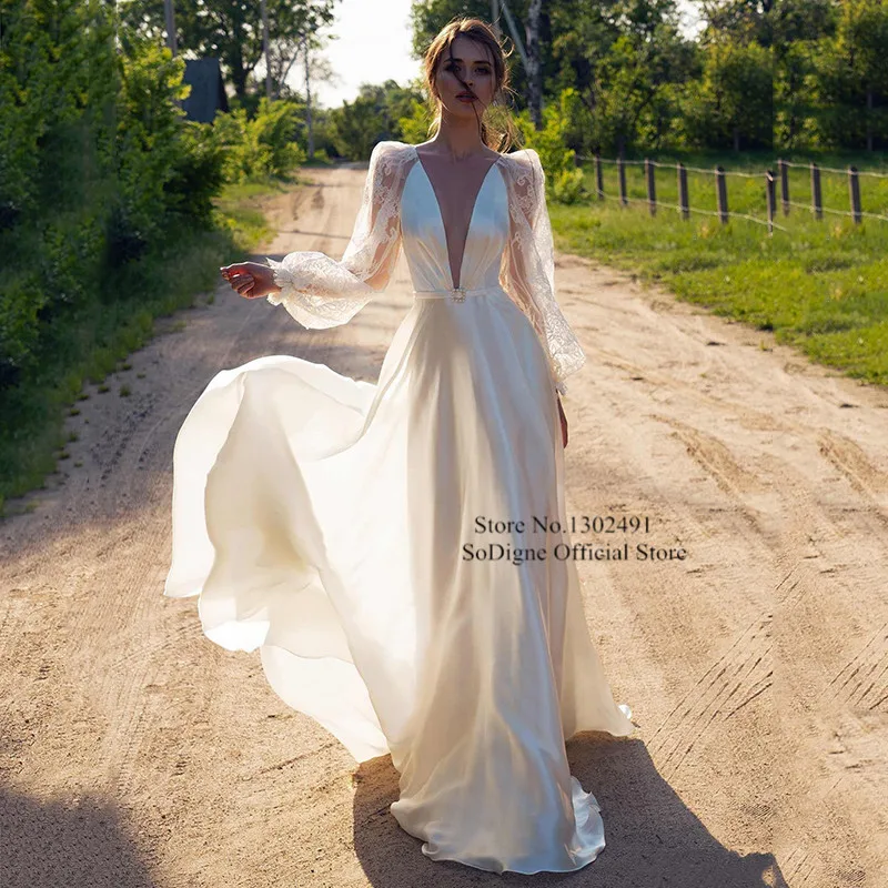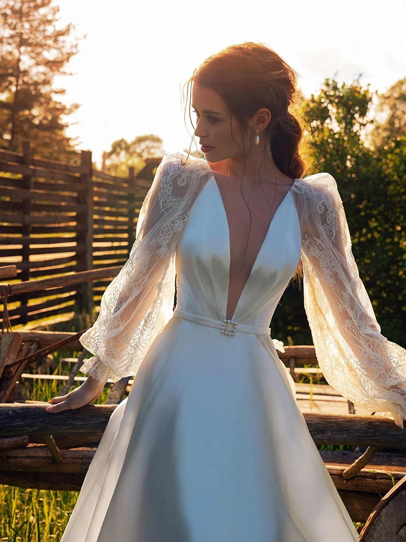 Платье свадебное с V-образным вырезом, длинным рукавом и кружевной ...