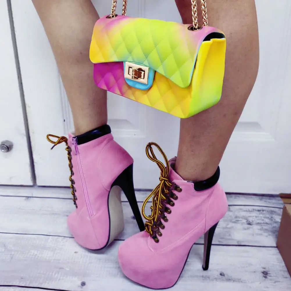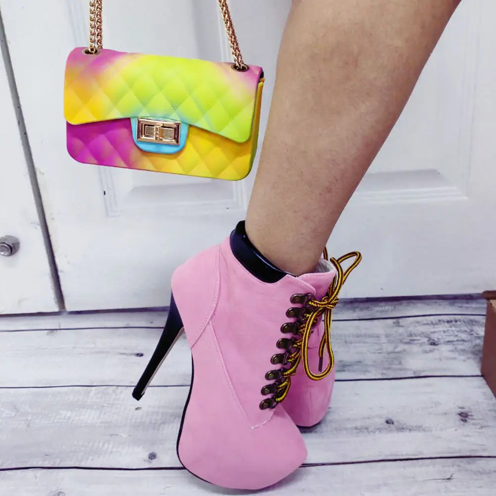 2020 брендовые новые модные зимние женские туфли и сумочки; Цвет розовый, черный; Пикантные вечерние ботильоны на платформе и высоком каблуке