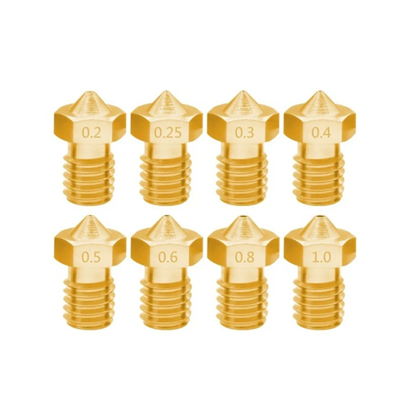 Спецификация: Цвет: золото Материал: латунь Диаметр шестигранника: 7 мм или 3 мм Резьба винта: М6 Входной диаметр: 1,75 мм Выходной диаметр: 0,2 мм, 0,3 мм, 0,4 мм, 0,5 мм, 0,6 мм, 0,8 мм, 1,0 мм Прочный материал: печатные головки E3D с соплом изготовлены из высококачественной латуни, прочные и долговечные
