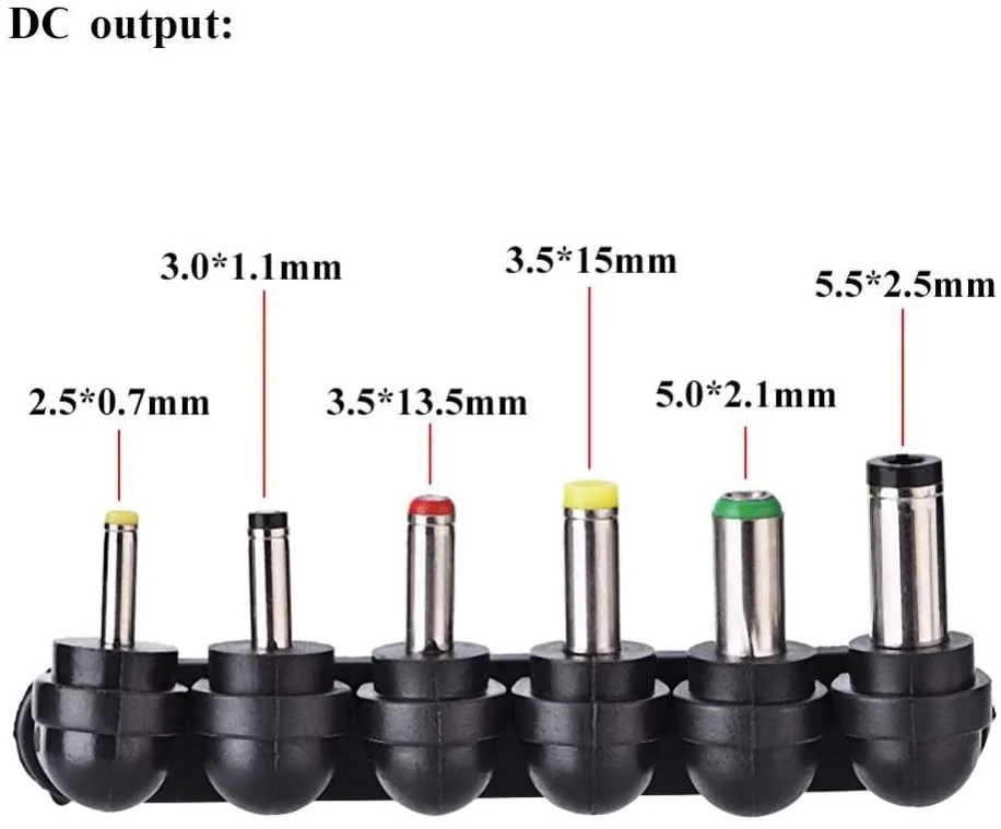 Размер штепсельной вилки постоянного тока (внешний диаметр и внутренний диаметр):2,5*0,7 мм, 3,0*1,1 мм, 3,5*1,35 мм, 4,0*1,7 мм, 5,0*2,1 мм, 5,5*2,5 мм