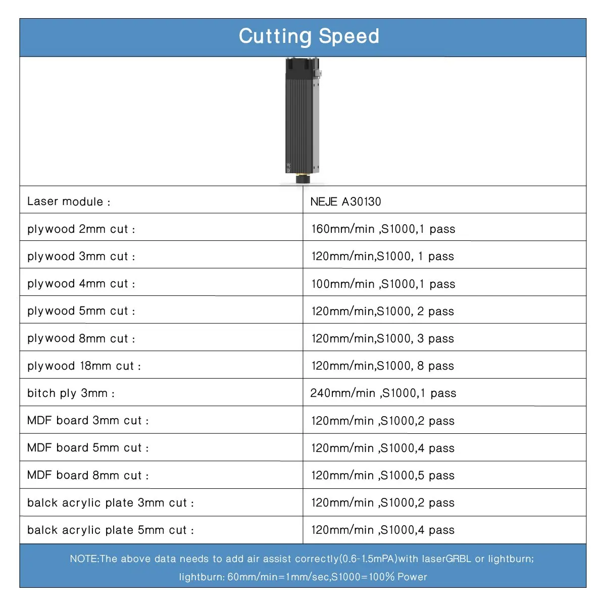 Модуль 20 Вт режет 3 мм фанеры (композит) в 3 проходах каждого 3 мм/сек., с воздушным ассорти (70 л/м). Этот 40 Вт модуль режет ту же фанеру в 2 проходах 5 мм/сек. (со мной выдувает дым). Это означает, что это (3/3 =)1 мм/сек. для модуля 20 Вт и (5/2 =) 2,5 мм/сек. для модуля 40 Вт. Я надеюсь, что он будет работать немного лучше с правильной воздушной подушкой (напечатайте сопло для него сейчас). Так что сейчас, кажется, что это в 2,5 раза быстрее. Чисто. Согласно спецификациям Neje, необходимо достичь скорости в 3 раза больше, чем 3 x световой поток в качестве модуля 20 Вт. Я думаю, что размер 40 Вт немного больше. Поэтому, возможно, что вы не сможете нарезать 3 раза быстрее.