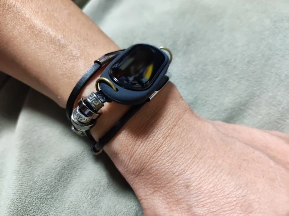 Откровенно ремешок на троечку 3 сплошные полоски кожи, часы вставляются в резинку и крепятся на ней так что кожа перекрывает датчики, ну хоть бусины с него перевешу на другой браслет