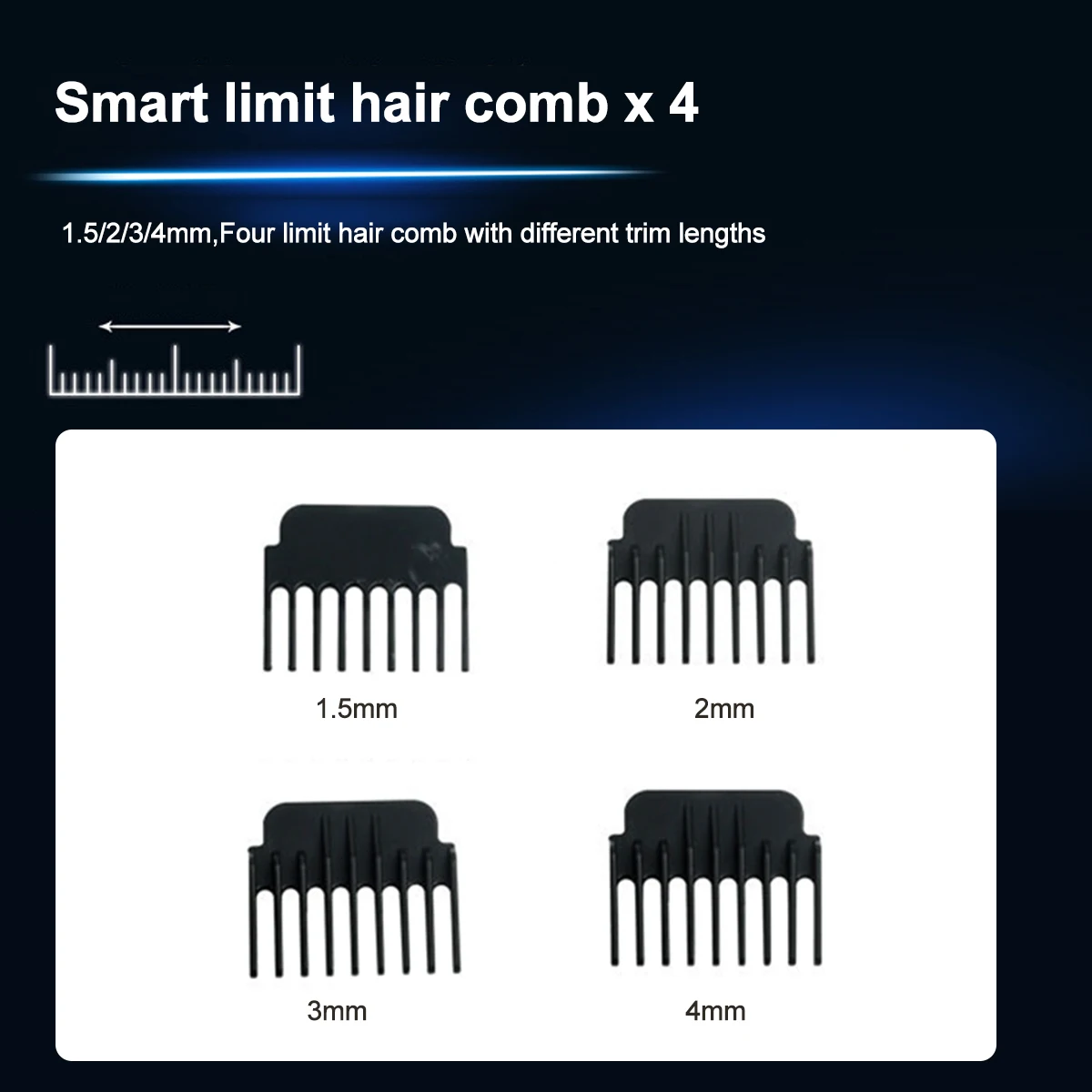 Особенности:-Водонепроницаемый, легко чистится.-Четыре предела (1,5/2/3/4 мм) для различной длины волос.-Низкий уровень шума, низкий уровень децибел, Отсутствие серьезных шумов во время работы.-Дизайн с углом обзора, не царапает кожу.-Usb-зарядка, может заряжаться мобильным питанием/ноутбуком/автомобилем, удобно и быстро.