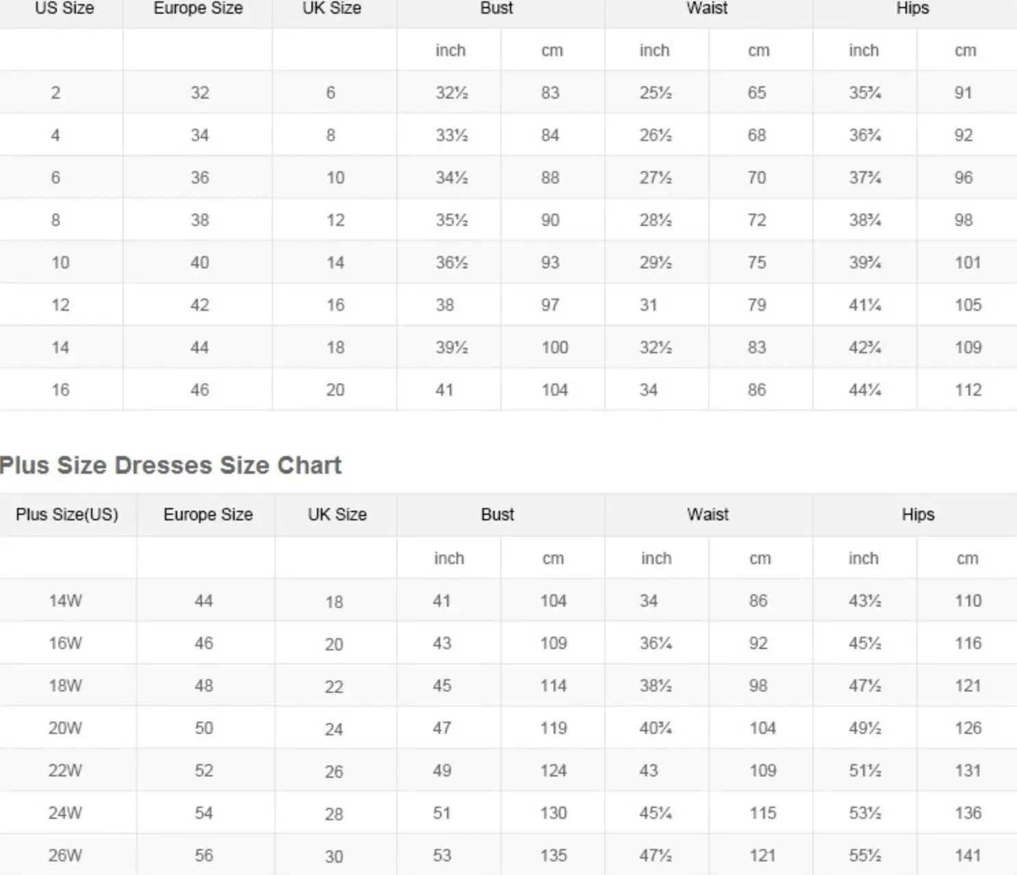 Таблица размеров