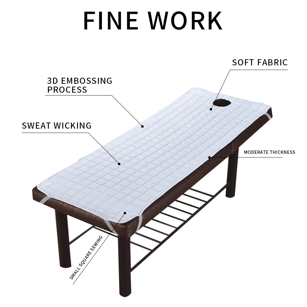 Особенности:Изготовлено из мягкой волокнистой ткани, материал поглощает пот для комфортного отдыха.Процесс тиснения 3D используется для увеличения трения.Белый и прозрачный перьевой бархат наполнен, пушистый и удобный, не будет завязываться для долгосрочного использования.Изысканный трёхмерный процесс стегания, матрас не только имеет хорошую плоскость, но и более красивый и аккуратный для профессионального использования.Эластичная лента прочная и расположена на четырех углах, так что вы можете легко зафиксировать ее на кровати для противоскользящей, так что ее удобнее лежать на ней.Отверстие точно измеряется и хорошо сочетается с массажной кроватью.