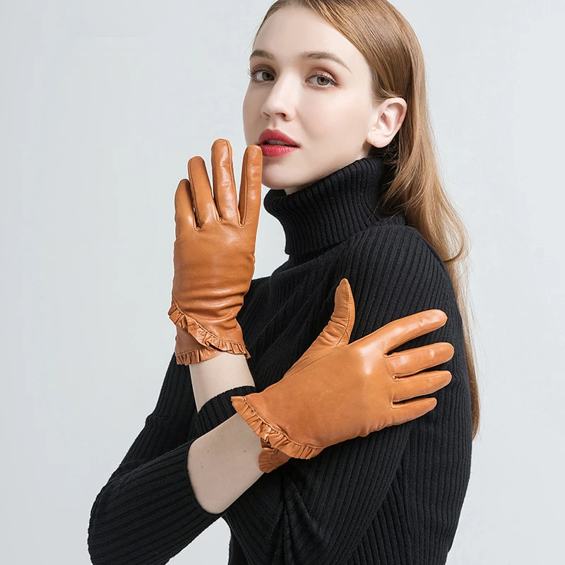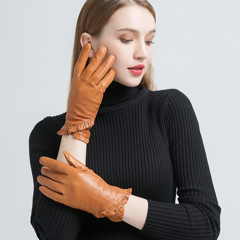 Женские перчатки из натуральной козьей кожи H, светильник-коричневые мягкие теплые зимние перчатки с цветочной окантовкой, L054