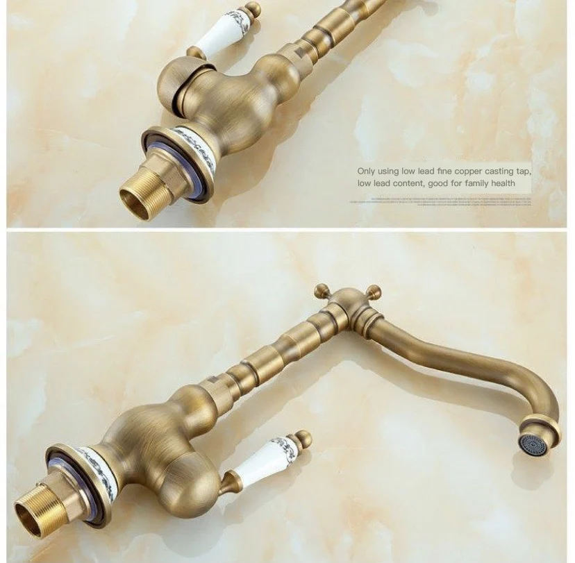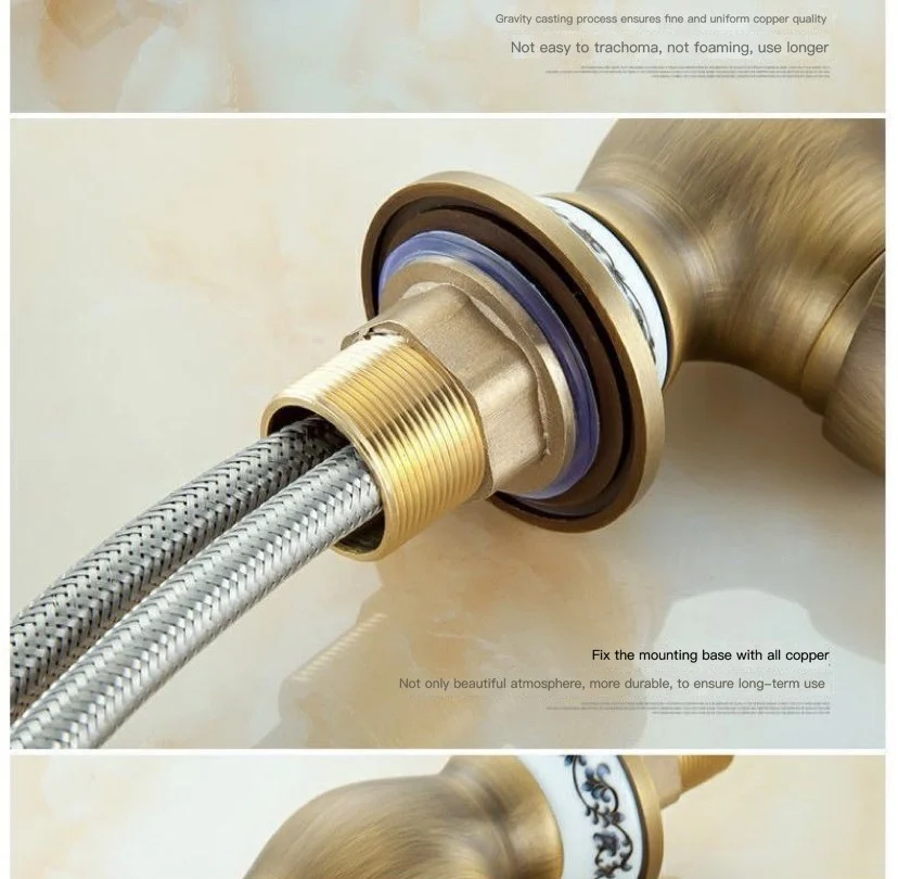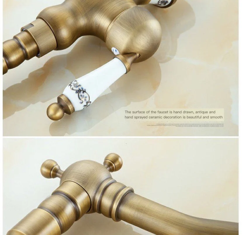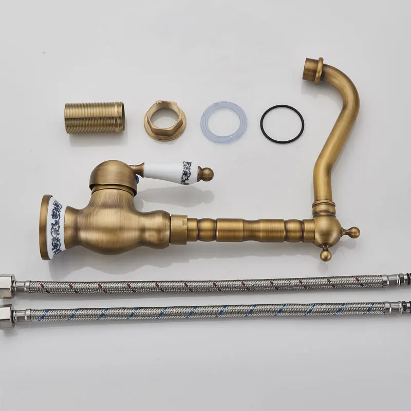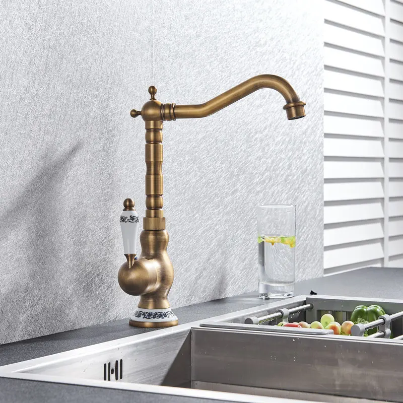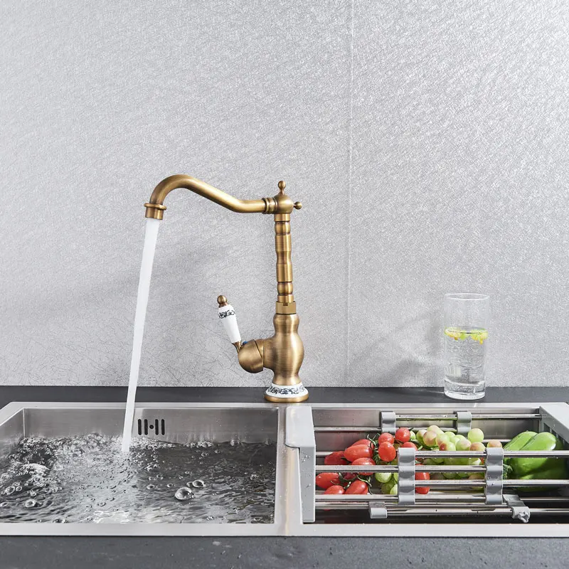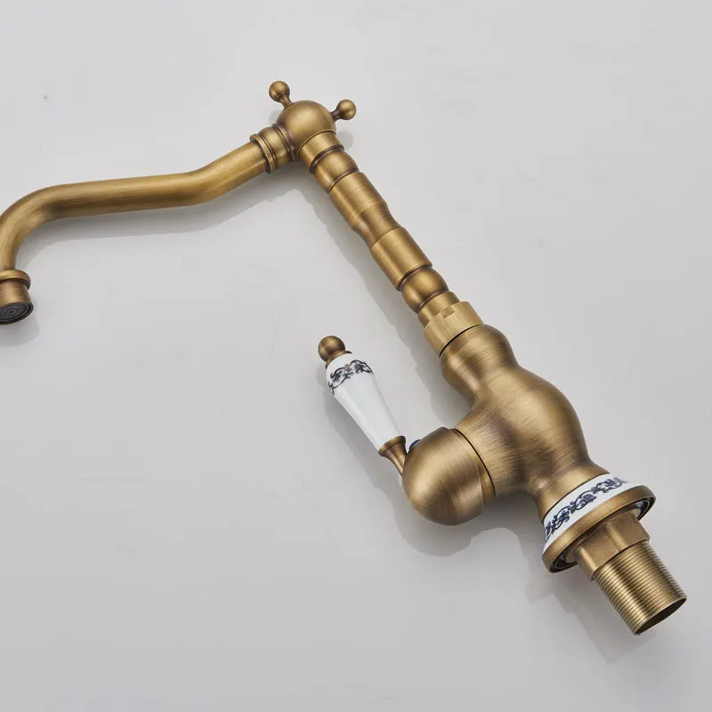 Античный латунный Смеситель для кухни, кран горячей и холодной воды, одно отверстие, вращающийся кран для ванной, синяя и белая фарфоровая ручка