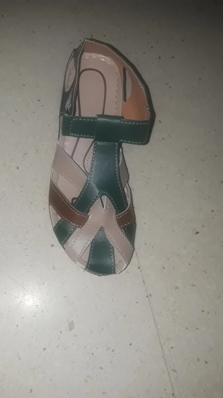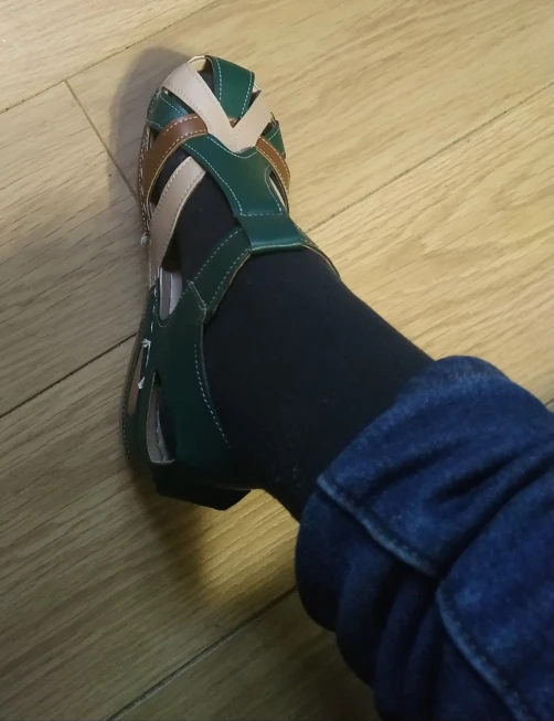 Есть небольшие косячки: чуть короче левый ремешок, чем правый, пара не самых аккуратных строчек, кожзам не самый качественный. Но на лето, на повседневку, будет отлично. Очень красивый оттенок зелёного. На русский 35 (22,5 см длина стопы) и среднюю полноту стопы китайский 35 подошёл идеально.