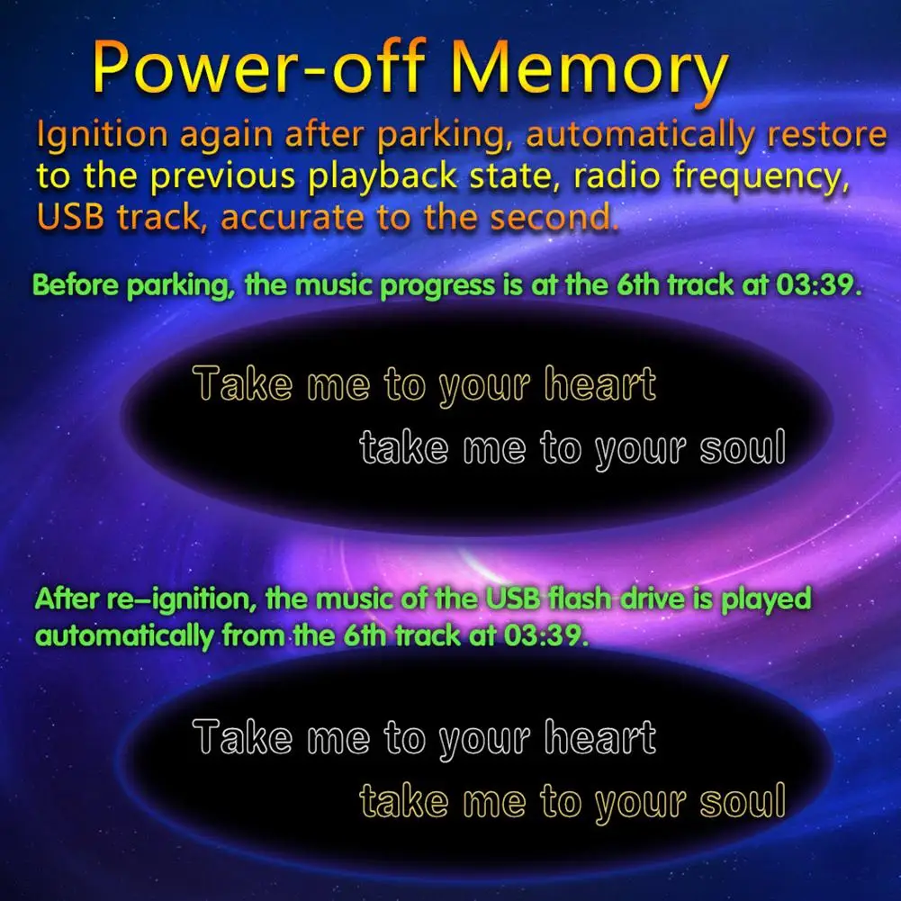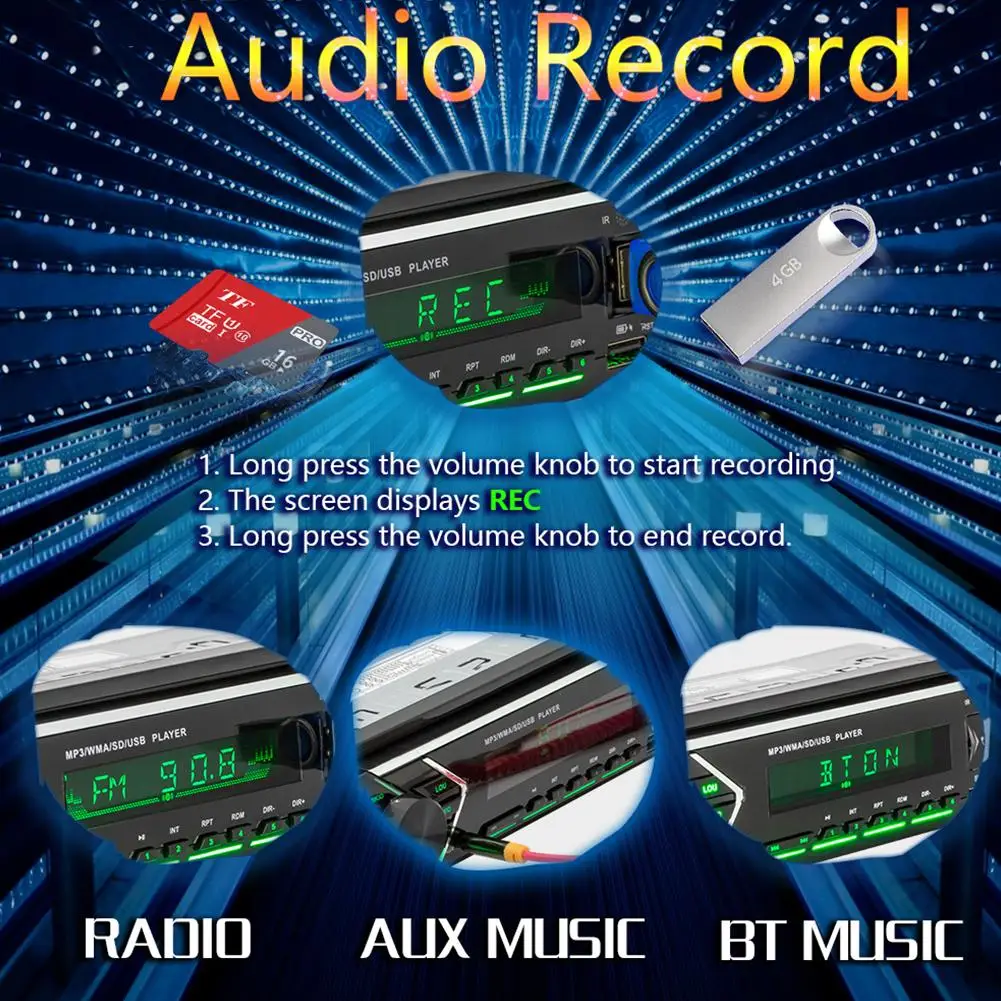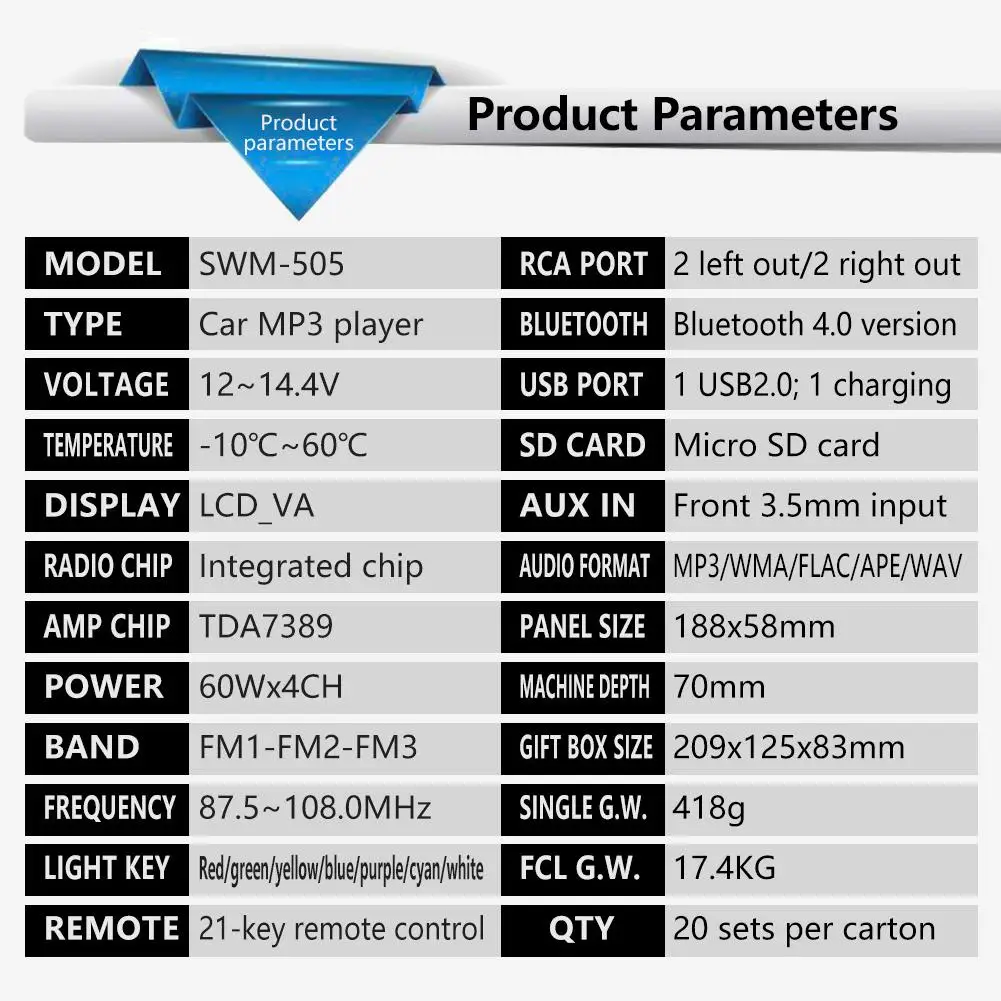 1. Bluetooth для воспроизведения музыки Bluetooth для совершения и приема звонков и функция AUX.2. Цифровое высококачественное FM-стерео радио (FM87.5 ~ 108 MHz).3. Поддержка кардридера и U-диска (аудио).4. Поддержка аудио: MP3/WMA/WAV/FLAC.5. Аудиовыход RCA можно подключить к сабвуферу.6. Красочные крутые огни.7. Функция копирования звука, поддержка записи источника звука, вы можете напрямую скопировать радиовещание, музыку AUX и музыку Bluetooth на U-диск.Технические характеристики (примерно):Тип: Магнитола MP3 плеерСпециальная функция: FM-радио, Bluetooth, звонки в режиме громкой связи, mp3-плеер, AUX, двойная USB-зарядка,Модель: 505Напряжение: 12 ВОС: нетПрограммное решение: AB3510Чип усилителя: TDA7389Тип экрана: ЖК-экранРазмер панели: около 188*58 мм/7,40*2,28 дюймаСветильник Панель: разноцветный переменный светРазмер цветной коробки: около 220*82*181 мм/8,66*3,23*7,13 дюймаГлубина хоста: около 60 мм/2,36 дюймаВес одной машины: около 418 гРадиодиапазон: FM 87,5 ~ 108 МГцРадиомикросхема: Интеграция микросхемМощность: 4*60 ВтSNR (дБ): ≥ 60 дБСтепень искажения (%): ≤ 0.3%Чувствительность: менее 20 дБСтерео разделение: более 25 дБРабочая температура: -10 ~ 60 ° СМодель Bluetooth: AUTO BTВерсия Bluetooth: 4,0Радиочастота: 87,5 ~ 108 МГцСлот для TF-карты: ДаПульт дистанционного управления: ПоддержкаИнтерфейс USB и версия: USB2.0Кнопка: Физическая кнопкаПредставление RCA-терминала: 4-канальный аудиовыходАудиовход AUX: естьПоддерживаемые Аудио форматы: MP3 / WMA / WAV / FLACКомплектация:1 mp3-плеер1 шнур питания1 x Акустический кабель2 x ключ для снятия1x пульт дистанционного управления1 Руководство пользователяПримечания:1. Этот продукт является аппаратом 12 В, а не эластичной Мощностью 24 В.2. Возможны небольшие отклонения в размерах из-за ручного измерения, различных методов измерения и инструментов.3. Изображение не соответствует фактическому цвету изделия из-за разсветильник фотографирования, углов и мониторов.