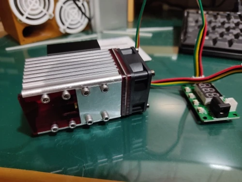 Всё пришло в комплекте. Упаковано хорошо. Блок питания 12в 3А. Сначала отдельно проверил PWM, с блоком питания потом подключил лазер. Светит сильно, на 20% прожигает белую бумагу. Радиатор и охлаждение разочаровало - термоконтакта лазера с радиатором очень мало и термопасты всего 30% от площади намазано. Внутри стоит контроллер который мерит температуру и регулирует обороты вентилятора. В цифровом виде передаёт её в индикатор. Преобразователь на плате лазера и контроллера даёт пачку импульсов от ширины PWM (в 200Гц) частотой 500кГц. Посмотрим как будет дальше. На 25% PWM нагрелся до 35С. Отправил быстро и шло меньше месяца! супер!!
